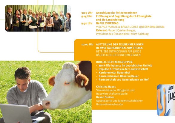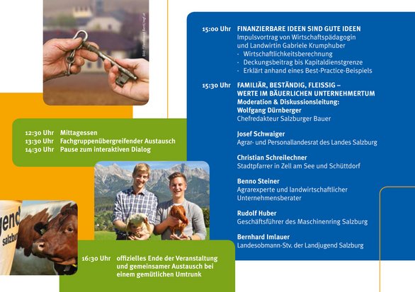 Der Tag der jungen Landwirtschaft ist ein Landwirtschaftskongress für junge HofübernehmerInnen und agrarisch interessierte Jugendliche. Es wird hier die Möglichkeit geboten, sich mit Alterskollegen auszutauschen, zu vernetzen und neue Inputs aus Expertenhand zu erfahren. Neben dem Auftakt des Präsidenten des Ökosozialen Forums Salzburg, Rupert Quehenberger, zum Jahresthema der Landjugend erwarten die TeilnehmerInnen, Workshops von Seminarbäuerin und Bloggerin Christina Bauer und Agrarunternehmensberater Benno Steiner. Die neuen Ideen der jungen HofübernehmerInnen sollen auch finanzielle Früchte tragen. Wirtschaftspädagogin Gabriele Krumphuber gibt anschließend Einblick in die Finanzierbarkeit von unternehmerischen Vorhaben. Den Abschluss der Veranstaltung bildet die Podiumsdiskussion „Familiär, beständig, fleißig – Werte im bäuerlichen Unternehmertum“ bei der Vertreter aus Religion, Politik und Wirtschaft über den Werteerhalt in unserer Gesellschaft sowie über die Bedeutung, die bäuerlichen Familien zuteil wird, berichten. Bei gemütlichem Ausklang werden die Ergebnisse des Tages besprochen und reflektiert. Programmpunkte und Inhalte: