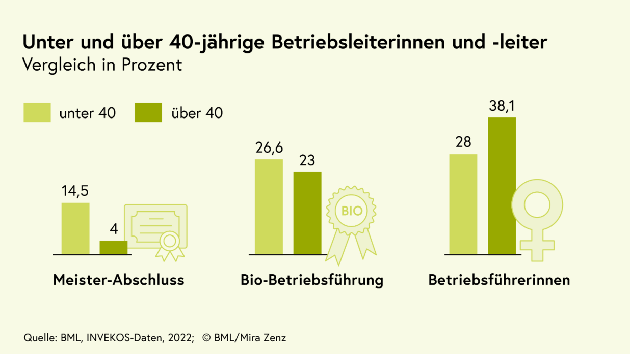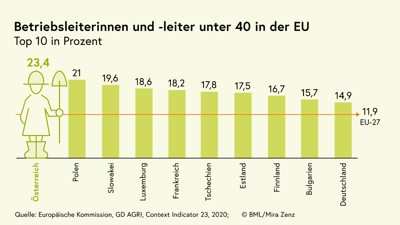Waren bei uns im Jahr 2020 23,4 % der Betriebsleiterinnen und -leiter unter 40, so waren es im EU-Schnitt mit 11,9 % nur rund halb so viele.