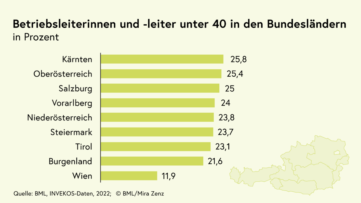 Von Ost bis West, von der Almwirtschaft bis zum Weinbau. Die Landwirtschaft in unseren Regionen ist vielfältig. Trotz unterschiedlicher Sparten ist der Anteil der unter 40-jährigen Betriebsleiterinnen und -leiter in allen Bundesländern, mit Ausnahme von Wien, ungefähr gleich.