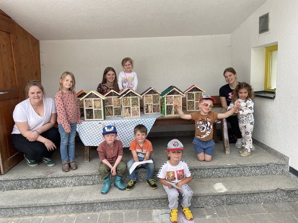 Am 9. April begann schließlich die praktische Umsetzung. Die Landjugend besuchte den Kindergarten in Piesendorf, wo die Kinder mit Begeisterung halfen, vorbereitete Insektenhäuser zu befüllen. Sie verwenden dafür natürliche Materialien wie Tannenzapfen, Holz, Stroh und Holzwolle. Anschließend bemalten die Kinder die Insektenhäuser in bunten Farben und gestalteten sie mit viel Kreativität. Auch aus alten Dirndlschürzen vorgenähte Säckchen wurden von den Kindern mit Kartoffeldrucken verschönert. Die Begeisterung der Kleinen war groß, und die Freude am kreativen Schaffen war in jedem Moment spürbar