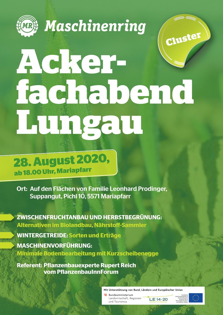 Im Rahmen der Veranstaltung erwartet die Besucher ein interessanter Abend mit Themen rund um die Ackerwirtschaft im Lungau. Referent Rupert Reich, Planzenbauexperte vom PflanzenbauInnForum gibt Informationen zum Zwischenfruchtanbau und die Herbstbegrünung. Weiters wird ein Fokus auf die Alternativen für Bio-Betriebe gelegt. Einen Einblick in den Anbau regionaler Wintergetreidesorten und deren Erträge folgt. Als Highlight gibt es eine Maschinenvorführung. Dabei wird die Bodenbearbeitung mit einer Kurzscheibenegge demonstriert.