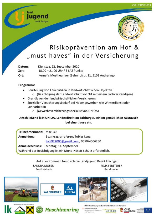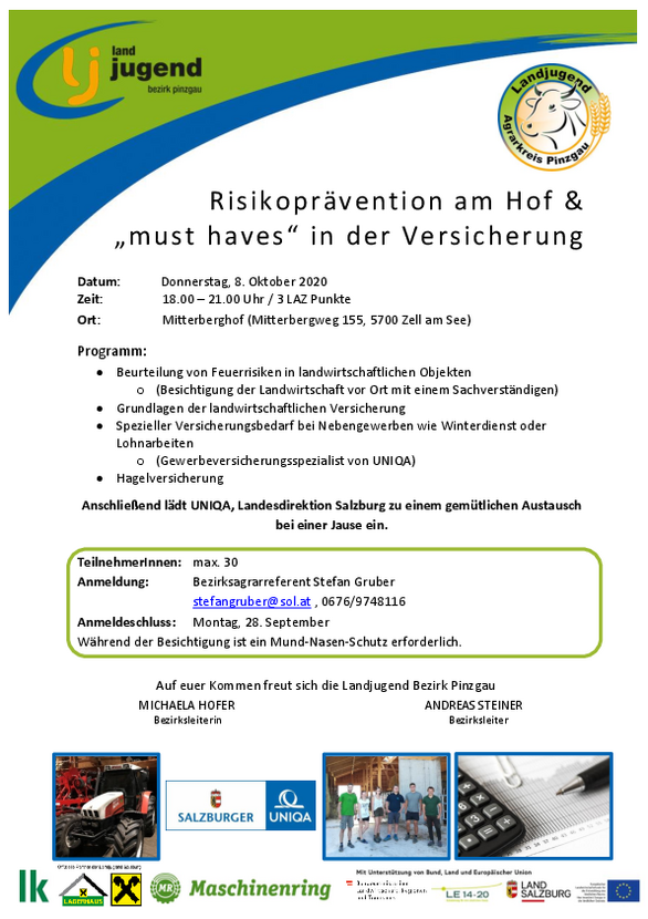 Geplant sind einerseits eine Veranstaltung im Flachgau und andererseits eine Innergebirg im Pinzgau. Diese Veranstaltungen sind aber Bezirksübergreifend gedacht, sprich für alle offen. Um eine verbindliche Voranmeldung wir gebeten. (Anmeldung über deinen Bezirksagrarreferenten oder per margreth.rehrl(at)lk-salzburg.at, 0662/641248372)