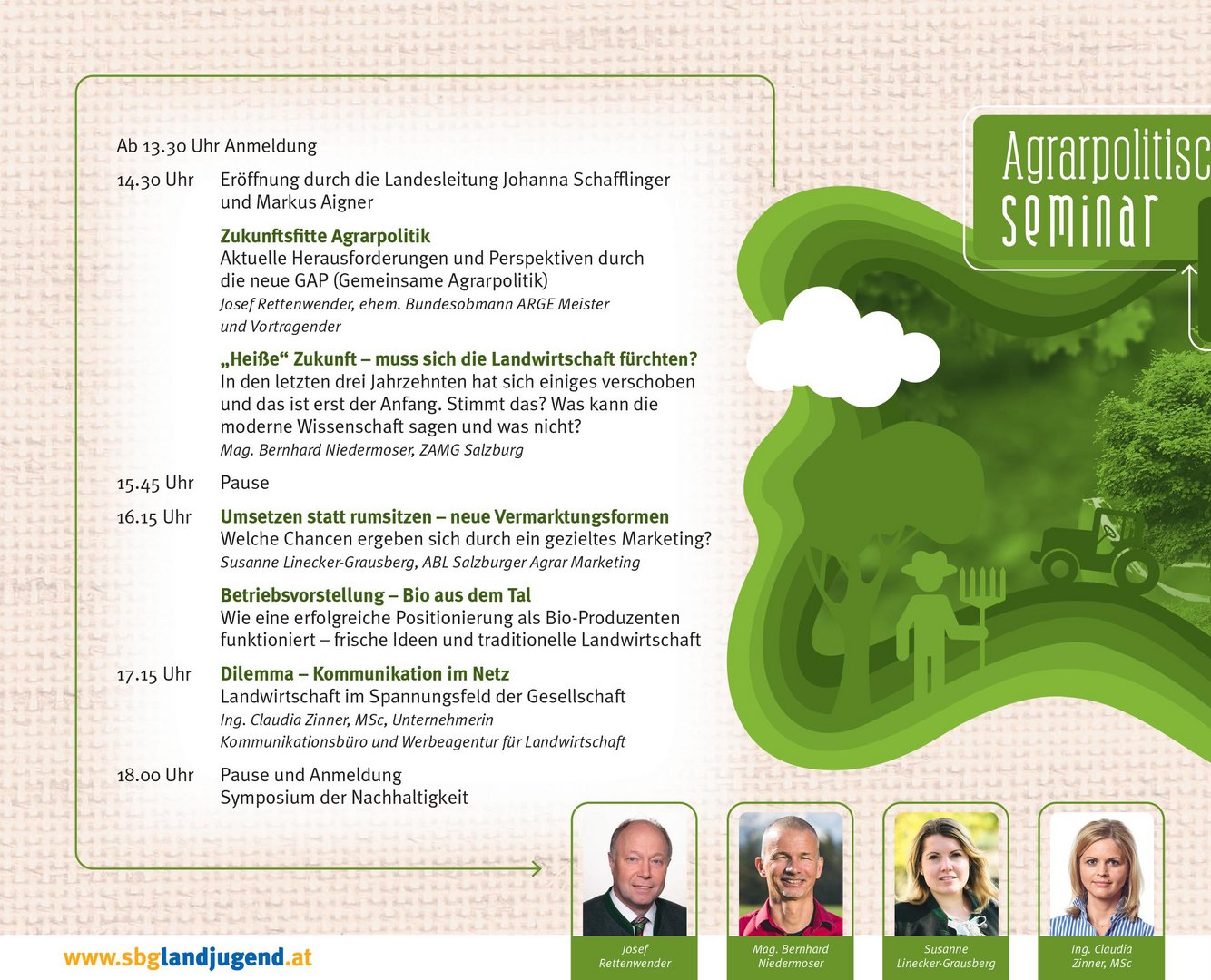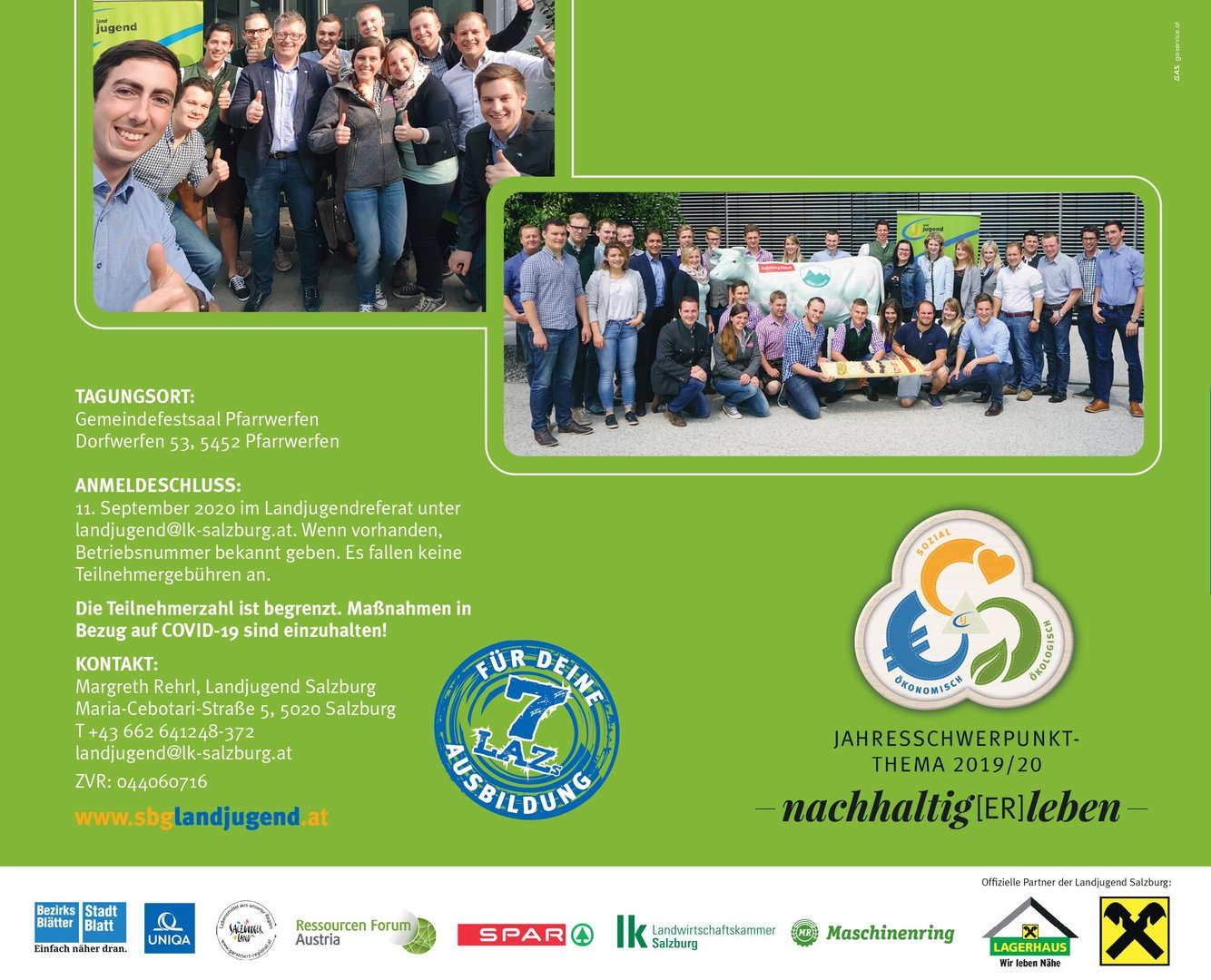 Am 19. September 2020 veranstaltet die Landjugend Salzburg zum ersten Mal nach einer dreijährigen Pause wieder das Agrarpolitische Seminar. Im Anschluss findet als Abschluss des Jahresschwerpunktthema 2019/20 "nachhaltig[ER]leben" das Symposium der Nachhaltigkeit statt.