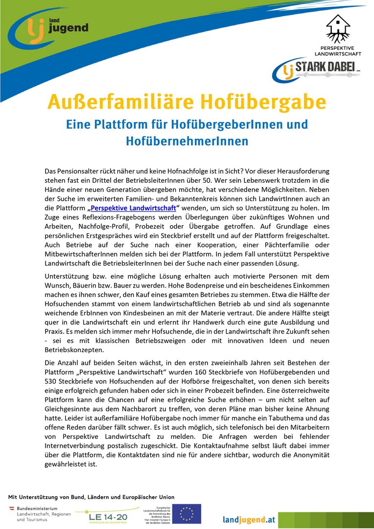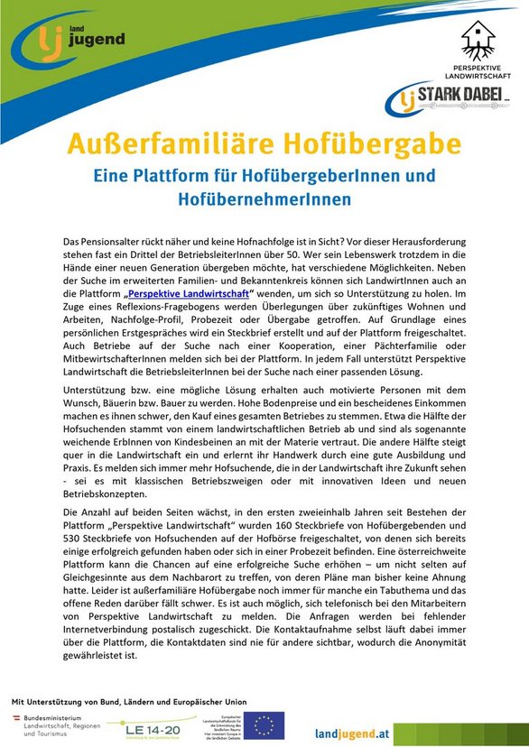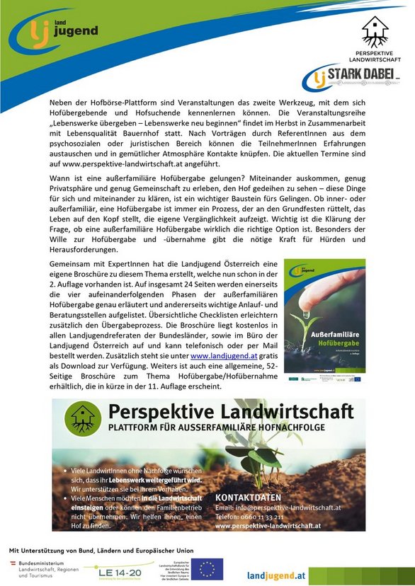 Gemeinsam mit ExpertInnen hat die Landjugend Österreich eine eigene Broschüre zu diesem Thema erstellt, welche nun schon in der 2. Auflage vorhanden ist. Auf insgesamt 24 Seiten werden einerseits die vier aufeinanderfolgenden Phasen der außerfamiliären Hofübergabe genau erläutert und andererseits wichtige Anlauf- und Beratungsstellen aufgelistet. Übersichtliche Checklisten erleichtern zusätzlich den Übergabeprozess. Die Broschüre liegt kostenlos in allen Landjugendreferaten der Bundesländer, sowie im Büro der Landjugend Österreich auf und kann telefonisch oder per Mail bestellt werden. Zusätzlich steht sie unter gratis als Download zur Verfügung. Weiters ist auch eine allgemeine, 52-Seitige Broschüre zum Thema Hofübergabe/Hofübernahme erhältlich, die bereits in der 11. Auflage erschienen ist.
