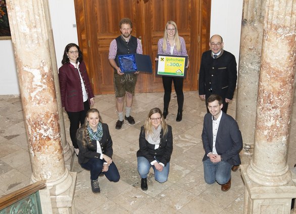 V.l.n.r. stehend: Michael Porenta Raiffeisen Salzburg, Projektleiter Andreas Zehner und Gruppenleiterin Michaela König der Landjugend Unternberg, Dir. MMMag. Dr. Anna Doblhofer-Bachleitner Raiffeisen Salzburg mit Landesleiterin Johanna Schafflinger und Landesobmann Markus Aigner der Landjugend Salzburg