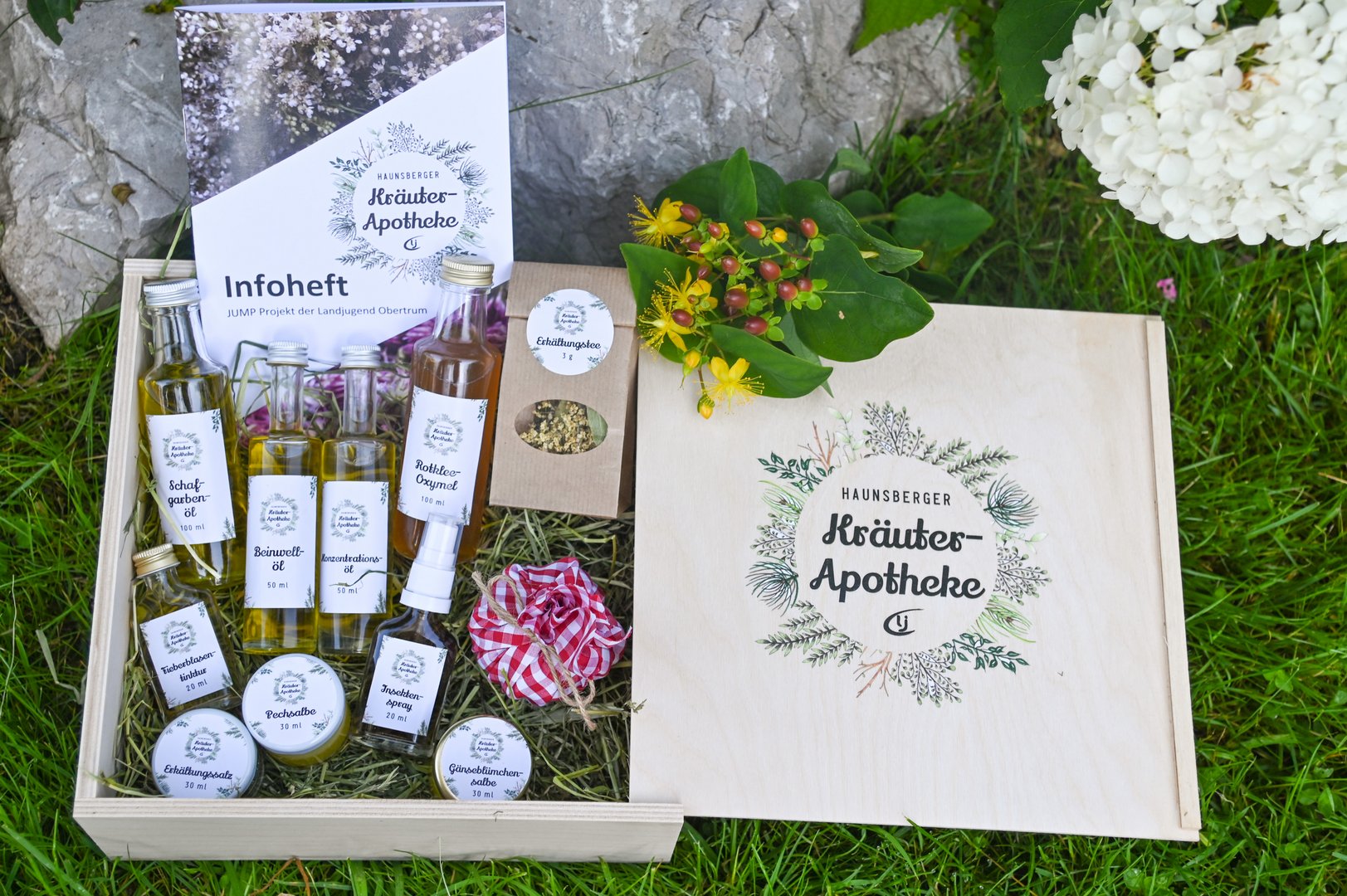 Die „Haunsberger Kräuterapotheke“ ist eine gut gewählte Mischung verschiedener Produkte, die die Landjugend Obertrum hergestellt hat. Viele verschiedene Kräuter haben die Landjugendmitglieder direkt auf den Wiesen und in den Wäldern des Haunsbergs gesammelt. In 930 ehrenamtlichen Stunden wurden Kräuter gepflückt, Heustempel genäht, Produkte angesetzt und abgefüllt, Etiketten befestigt und 200 Kisten bestückt.