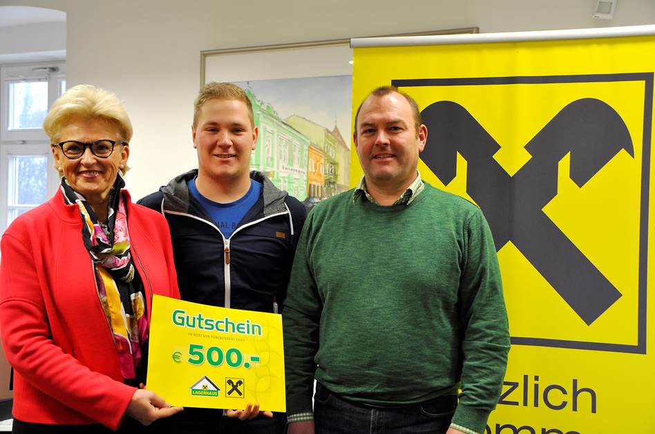 Die Bezirksblätter Salzburg verlosten gemeinsam mit dem Salzburger Lagerhaus beim Tag der Landjugend Salzburg € 500,- einen Lagerhaus-Gutschein. Alexander Felber aus Göming hat beim Gewinnspiel der Bezirksblätter zum Tag der Landjugend Salzburg sein Glück versucht und wurde per Los als Gewinner gezogen. Der sympathische Alex ist 18 Jahre alt und Schüler im 5. Jahrgang an der HBLA Ursprung. Da er nach dem Abschluss mit Matura den elterlichen Hof übernehmen wird, kann er die € 500,- sehr gut gebrauchen. „Da fällt mir ganz bestimmt etwas ein, das ich für unseren Bauernhof brauche“, so der fleißige Alexander. Er ist neben der Schule und der Landwirtschaft auch in der Landjugendgruppe Göming als Fahnenträger sehr aktiv. Übergeben wurden die Gutscheine von der langjährigen Filialleiterin der Raiffeisenbank Oberndorf, Maria Bader und dem Filialleiter des Lagerhauses Oberndorf, Josef Kohlbacher. Bild: v.l.n.r.: Maria Bader, Filialleiterin Raiffeisenbank Oberndorf, Gewinner Alexander Felber und Josef Kohlbacher, Filialleiter Lagerhaus Oberndorf. (Quelle: Birgit Leobacher, Bezirksblätter Salzburg)