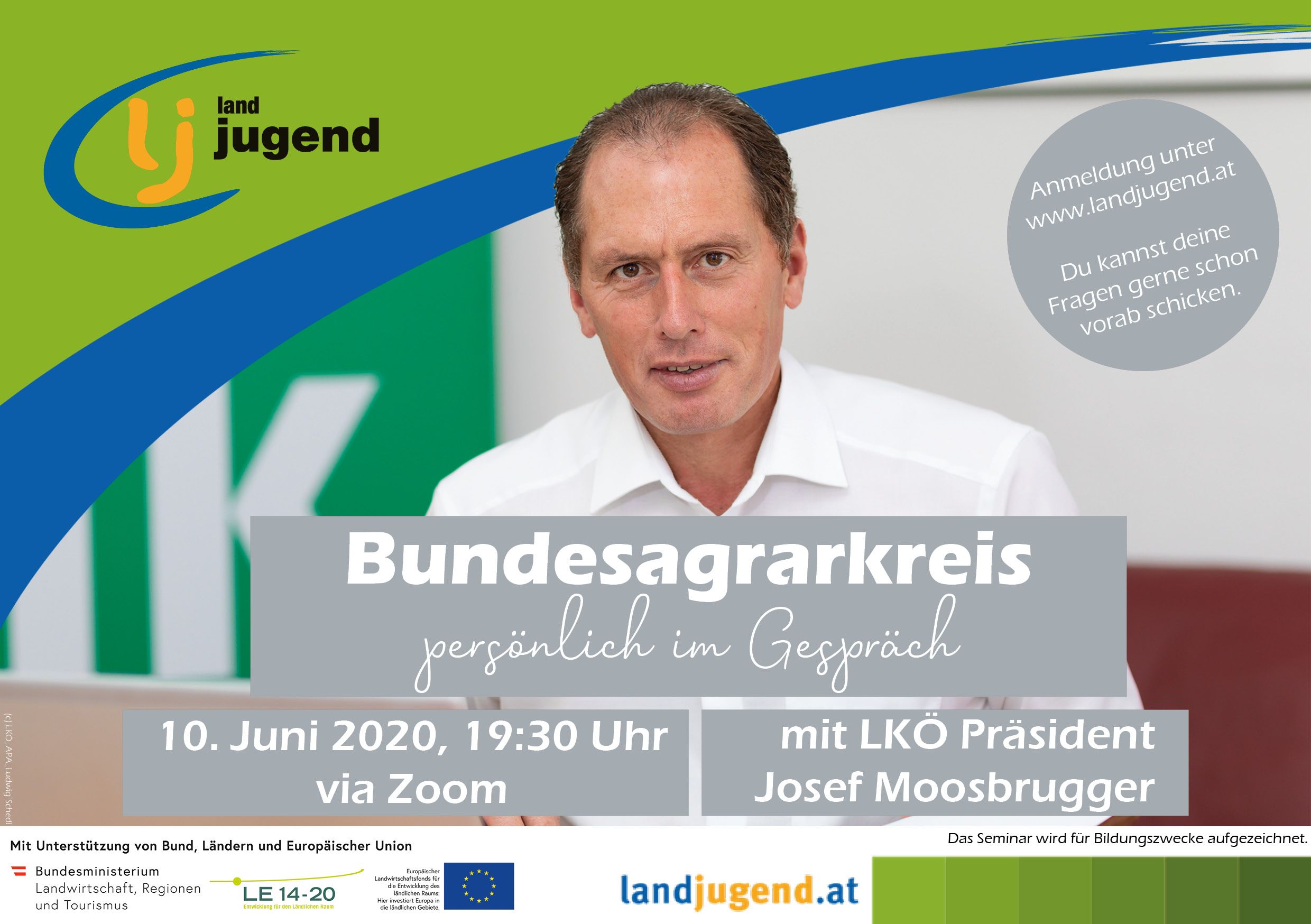 Zum nächsten Online-Bundesagrarkreis begrüßt die Landjugend Österrei Josef Moosbrugger, Präsident der Landwirtschaftkammer Österreich. Gemeinsam werden Gedanken austauschen und alle TeilnehmerInnen bekommen die Möglichkeit interessante/kritische Fragen zur österreichischen Land- und Forstwirtschaft zu stellen, welche die derzeitige Situation betreffen. Natürlich kann jede/r du an ihn eine Frage richten, welche Dir auf der Zunge liegt.
