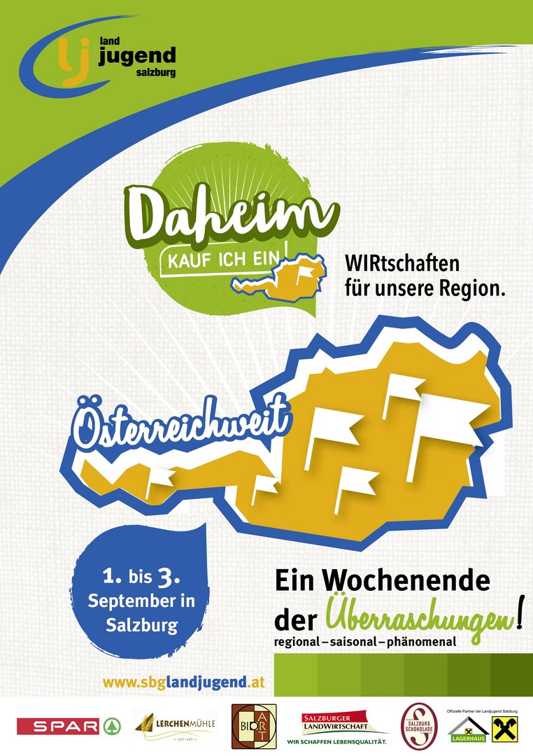 Von Mitte Juli bis Ende Oktober steht die Landjugend ganz im Zeichen gelebter Regionalität. In diesem Zeitraum werden an den Wochenenden in den einzelnen Bundesländern verschiedenste Projekte und Aktionen im Rahmen des Jahresschwerpunktthemas der Landjugend Österreich „Daheim kauf ich ein“ durchgeführt. Von 1. bis 3. September kommt die „Daheim kauf ich ein“-Tour nach Salzburg. Am Programm steht ein Wochenende der Überraschungen ganz nach dem Motto: regional – saisonal – phänomenal! Regionales Bewusstsein wecken Ziel ist es, das Bewusstsein für den Wert von Regionalität zu steigern und KonsumentInnen zu sensibilisieren, in der Region zu kaufen. „Mit dem Schwerpunkt „Daheim kauf ich ein“ zeigt die Landjugend, was Wirtschaften für die Region bewirkt“ sagt Andrä Rupprechter, Bundesminister für Land- und Forstwirtschaft, Umwelt und Wasserwirtschaft. „Jeder und jede Einzelne kann mit seiner Kaufentscheidung einen wichtigen Beitrag leisten, damit das Geld im lokalen Wirtschaftskreislauf bleibt, was wiederum Arbeitsplätze sichert und unser aller Lebensqualität beeinflusst.“