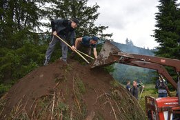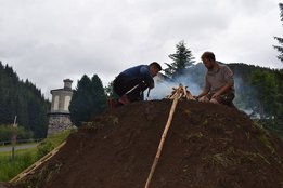 Für den Bau des Meilers verlegten die Mitglieder der Landjugend zu Beginn einen Holzboden auf der Erde und in der Mitte stellten sie einen Kamin aus Holz auf. Das darum aufgeschichtete Holz wird mit Fichtenästen abgedeckt, um einen guten Halt für die darauffolgende Erde zu schaffen, mit der der Meiler bedeckt wird. Anschließend baute Projektleiter Andreas Zehner mit den Landjugendmitgliedern in ca. einem Meter Höhe eine Art Steg drum herum, damit der Kohlenmeiler gut betreut werden kann. Und schließlich kann der Rundkohlenmeier entzündet werden. Dazu entfachte Experte Peter Moser auf dem Erdhaufen ein Feuer und die Glut wird in den Kamin geworfen. „Sobald das Holz zu brennen beginnt, muss der Kamin verschlossen werden, um die Luftzufuhr zu drosseln. Dadurch erreicht das Holz lediglich ein Glosen, kein Brennen. Durch die unvollkommene Verbrennung bleibt dann Kohle übrig“, erklärt Experte Peter Moser.