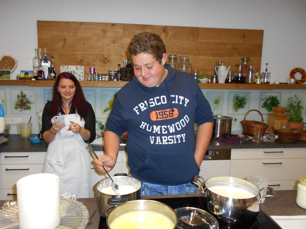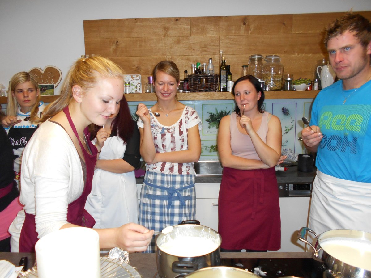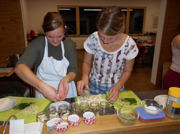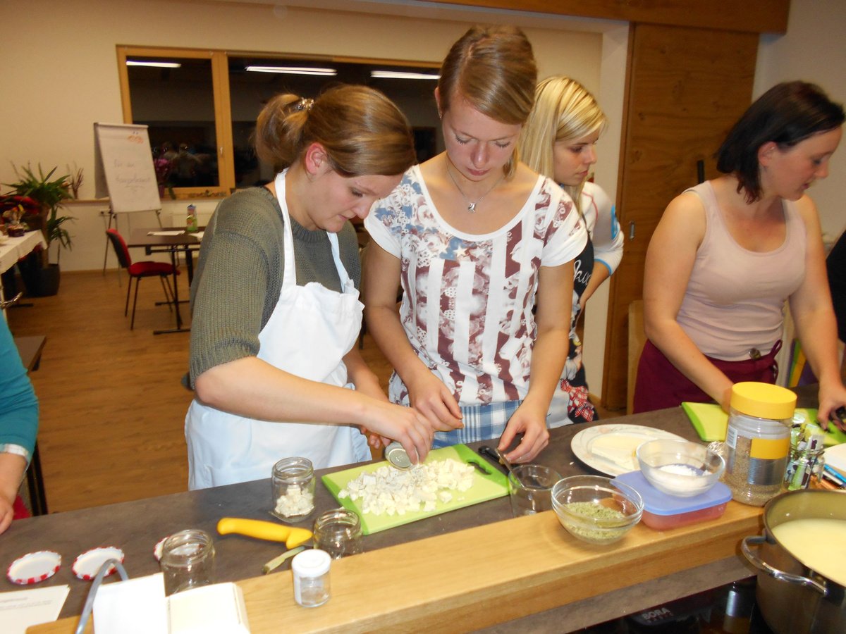 Dann starteten auch wir mit der Arbeit: Gemeinsam bereiteten wir an diesen Abend Frischkäse, Joghurt sowie Topfen zu. Anschließend probierten wir die Produkte im Rohzustand sowie die Molke, die entsteht, wenn Käse produziert wird. Danach verarbeiteten wir unseren Käse zu eingelegten Ölkäse mit Kräutern, Topfen zu verschiedensten Aufstrichvariationen und Joghurt zu köstlicher Trinkjoghurt. Als alles fertig war, haben wir unsere fertigten Produkte natürlich auch probiert. Wir waren alle sehr begeistert von diesem Abend. Als kleines Geschenk haben alle Teilnehmer ein Gläschen von dem selbstgemachten Ölkäse mit nach Hause nehmen dürfen. Ein großes Dankeschön geht natürlich an Heidi Huber, die wir bei unserem nächsten Kurs – dem Brotbackkurs – wieder besuchen dürfen.