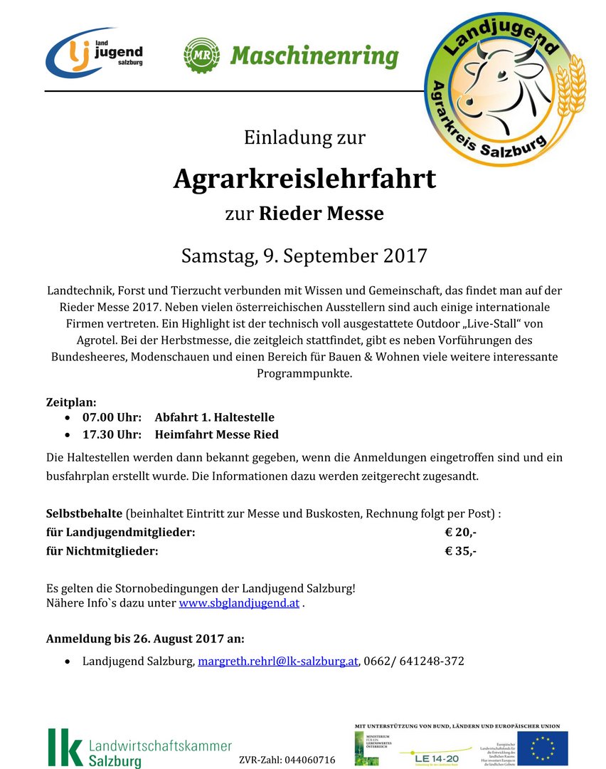 Selbstbehalte (beinhaltet Eintritt zur Messe und Buskosten, Rechnung folgt per Post): für Landjugendmitglieder: € 20,- für Nicht-Landjugendmitglieder: € 35,- Anmeldung bis 26.08.2017 an: Landjugend Salzburg, margreth.rehrl(at)lk-salzburg.at, 0662/641248-372