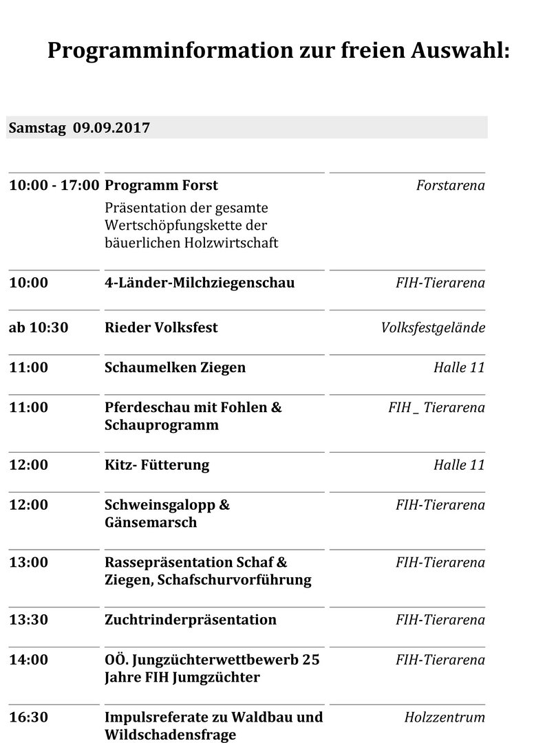Die Landjugend Salzburg begibt sich auch heuer wieder auf eine Agrarkreislehrfahrt. Dieses Mal wird die Rieder Messe besucht, welche im jährlichen Wechsel mit der Agraria in Wels statt findet. Alle Agrarinteressierten sind recht herzlich eingeladen am 09.09.2017 mit zu fahren. Die Rieder Messe – die erfolgreiche Kombination aus Landwirtschafts- und Herbstmesse – feiert ihr 150-jähriges Bestehen. Das Programm ist im Jubiläumsjahr besonders vielfältig, interessant und innovativ und begeistert mit einer besonderen Atmosphäre und der Mischung aus internationalen Zuchttierschauen, der Fachmesse für die Landwirtschaft, ebenso wie mit Konsumgütern aus den verschiedensten Branchen. Technikfans können sich auf eine Vielzahl von Grünland-, Forst- und Ackergeräte und Maschinen freuen. Hier der direkte Link zur Website der Rieder Messe