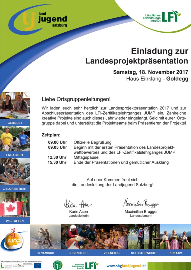 Projektarbeit wird bei Landjugend Salzburg sehr groß geschrieben. Jahr für Jahr stellen zahlreiche Ortsgruppen im gesamten Bundesland vielfältigste Projekte mit unzähligen ehrenamtlichen Arbeitsstunden und mit einem großen Ziel auf die Beine: Einen aktiven Beitrag für die Gemeinde leisten, dabei Gutes tun und die Gemeinschaft innerhalb und außerhalb der Landjugend stärken. Die Projekte 2017 werden nun im Rahmen der Landesprojektpräsentation & JUMP-Abschlusspräsentation auf die Bühne geholt und von einer fachkundigen Jury bewertet. Ob Wanderwegerneuerungen, soziale Projekte oder Spendenaktionen – die Projektvielfalt in den einzelnen Ortsgruppen ist Jahr für Jahr sehr groß. Der Kreativität und den guten Gedanken dahinter sind dabei keine Grenzen gesetzt. Zahlreiche Projekte werden Jahr für Jahr beim Landesprojektwettbewerb eingereicht. Heuer wurden 20 Projekte in die Realität umgesetzt, die Ergebnisse werden nun am 18. November 2017 vor einer fachkundigen Jury vorgestellt. Das Geheimnis, ob die Projekte Gold, Silber, Bronze oder Erfolgreich teilgenommen erhalten, wird anschließend beim 5. Tag der Landjugend Salzburg am 13. Jänner 2018 gelüftet. Zeitgleich mit der Landesprojektpräsentation findet die JUMP-Abschlusspräsentation statt. JUMP (Junge, unschlagbar motivierte Persönlichkeiten) ist ein LFI-Zertifikatslehrgang der Landjugend Salzburg und in vier Module aufgebaut. JUMP beschäftigt sich mit Rhetorik und Teambildung, mit Projektmanagement, Öffentlichkeitsarbeit und Veranstaltungsplanung. All diese Inhalte werden in fünf Seminartagen, einem Projektchoachingtreffen und einem Präsentationstraining vermittelt. Die gelernten Fähigkeiten werden anschließend bei der Planung und Durchführung eines eigenen Projektes angewandt und gefestigt. Den Abschluss bildet die Projektpräsentation, bei der die TeilnehmerInnen ihr Projekt einer Jury präsentieren.