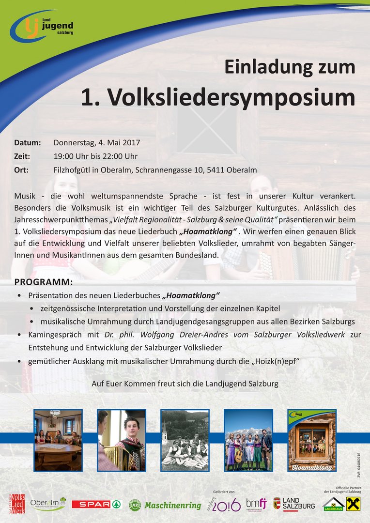 Am Donnerstag, den 4. Mai 2017 findet eine weitere Premiere im Jahresprogramm der Landjugend Salzburg statt. Junge, kultur- & brauchtumsbegeisterte Mitglieder sowie alle Interessierten treffen sich im Filzhofgütl in Oberalm zum 1. Volksliedersymposium der Landjugend Salzburg. Herzlich eingeladen sind alle landjugend- und volkliederbegeisterten Personen. Musik - die wohl weltumspannendste Sprache - ist fest in unserer Kultur verankert. Besonders die Volksmusik ist ein wichtiger Teil des Salzburger Kulturgutes. Anlässlich des Jahresschwerpunktthemas „Vielfalt Regionalität - Salzburg & seine Qualität“ präsentieren wir beim 1. Volksliedersymposium das neue Liederbuch „Hoamatklong“. Wir werfen einen genauen Blick auf die Entwicklung und Vielfalt unserer beliebten Volkslieder, umrahmt von begabten SängerInnen und MusikantInnen aus dem gesamten Bundesland.