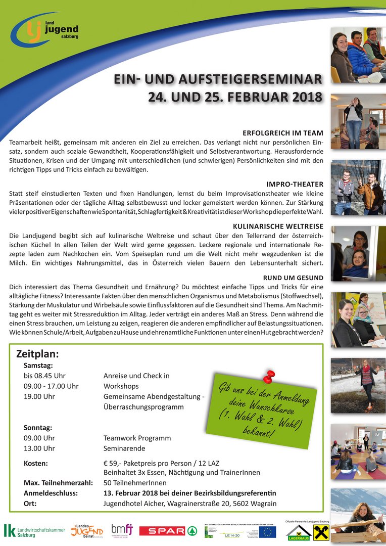 Von 24. bis 25. Februar 2018 findet wieder das legendäre Ein- und Aufsteigerseminar. Heuer das erste Mal in Wagrain - genauer gesagt im Jugendgästehaus Aicher (Wagrainerstraße 20, 5602 Wagrain). Jedes Jahr nehmen ca. 50 Landjugendmitglieder und FunktionärInnen aus dem ganzen Bundesland teil. Am Samstag können die TeilnehmerInnen aus vier Workshops auswählen: