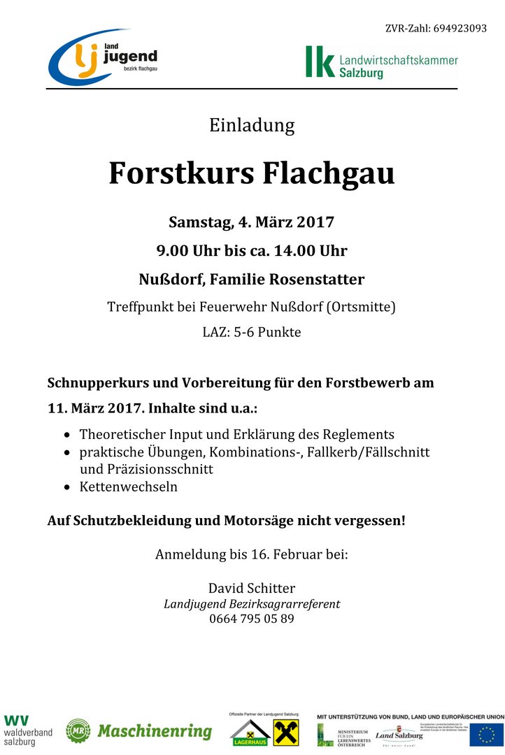Bundesbewerb und Staatsmeisterschaften: Die besten Vier qualifizieren sich für die Bundesmeisterschaften von 30. Juni bis 2. Juli 2017 auf der Messe Wieselburg in Niederösterreich. Für nähere Informationen zu den jeweiligen Stationen stehen diese als Download zur Verfügung. Die Anmeldung ist bis 3. März 2017 unter der Angabe der Motorsäge (ccm), Ortsgruppe und Alter unter landjugend(at)lk-salzburg.at möglich.