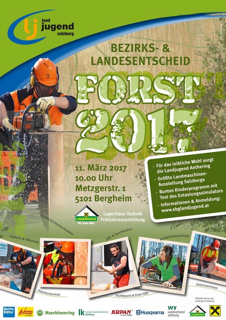 Veranstaltungsort: Lagerhaus-Technik Bergheim Metzgerstraße 1, 5101 Bergheim Der Forstwettbewerb ist fast schon Tradition bei der Frühjahrstechnik-Ausstellung. Bereits zum fünften Mal treffen sich forstbegeisterte Landjugendmitglieder in Bergheim und kämpfen um den Landessieg. „Die über 1.000 Besucher und die vielen Landmaschinen sorgen für eine einzigartige Atmosphäre“, weiß Landesobmann Maximilian Brugger. Bei der Planung und Durchführung arbeitet die Landjugend Salzburg eng mit den Partnern Lagerhaus-Technik, Maschinenring und Waldverband zusammen. „Um einen Forstwettbewerb durchführen zu können, braucht es einiges an Ressourcen. Mit dem Standort Bergheim haben wir den idealen Wettkampfplatz gefunden“, ergänzt Michael Lerchner, Geschäftsführer der Landjugend Salzburg. Zeitplan: