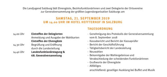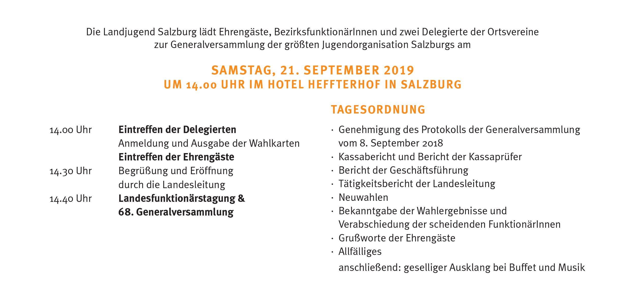 Das Vereinsjahr der Landjugend Salzburg neigt sich dem Ende zu. Am Samstag, den 21. September 2019 findet die diesjährige Landesfunktionärstagung & 68. Generalversammlung der größten Jugendorganisation Salzburgs statt. Dazu laden wir alle Orts- und BezirksfunktionärInnen herzlich ein! Dieser Tag ist ein Pflichttermin für alle wahlberechtigten FunktionärInnen! Wer ist bei der Landesfunktionärstagung und bei der Generalversammlung eingeladen? Und wer ist wahlberechtigt? Jede Ortsgruppe entsendet zwei Personen, die für die Ortsgruppe wählen und aktuelle Informationen entgegennehmen. In erster Linie sind das Leiterin und Leiter. Bei deren Verhinderung können auch StellvertreterInnen, Vorstandsmitglieder oder Landjugendmitglieder als Vertretung teilnehmen. Nach Absprache mit dem Landjugendreferat ist es möglich, dass auch mehr als zwei Personen einer Ortsgruppe an der Tagung teilnehmen. Von den Bezirksorganisationen sind alle FunktionärInnen herzlich eingeladen und wahlberechtigt. Anmeldung der Wahlberechtigten und TeilnehmerInnen bis Montag, 9. September im Landjugendreferat.