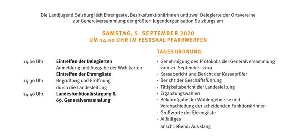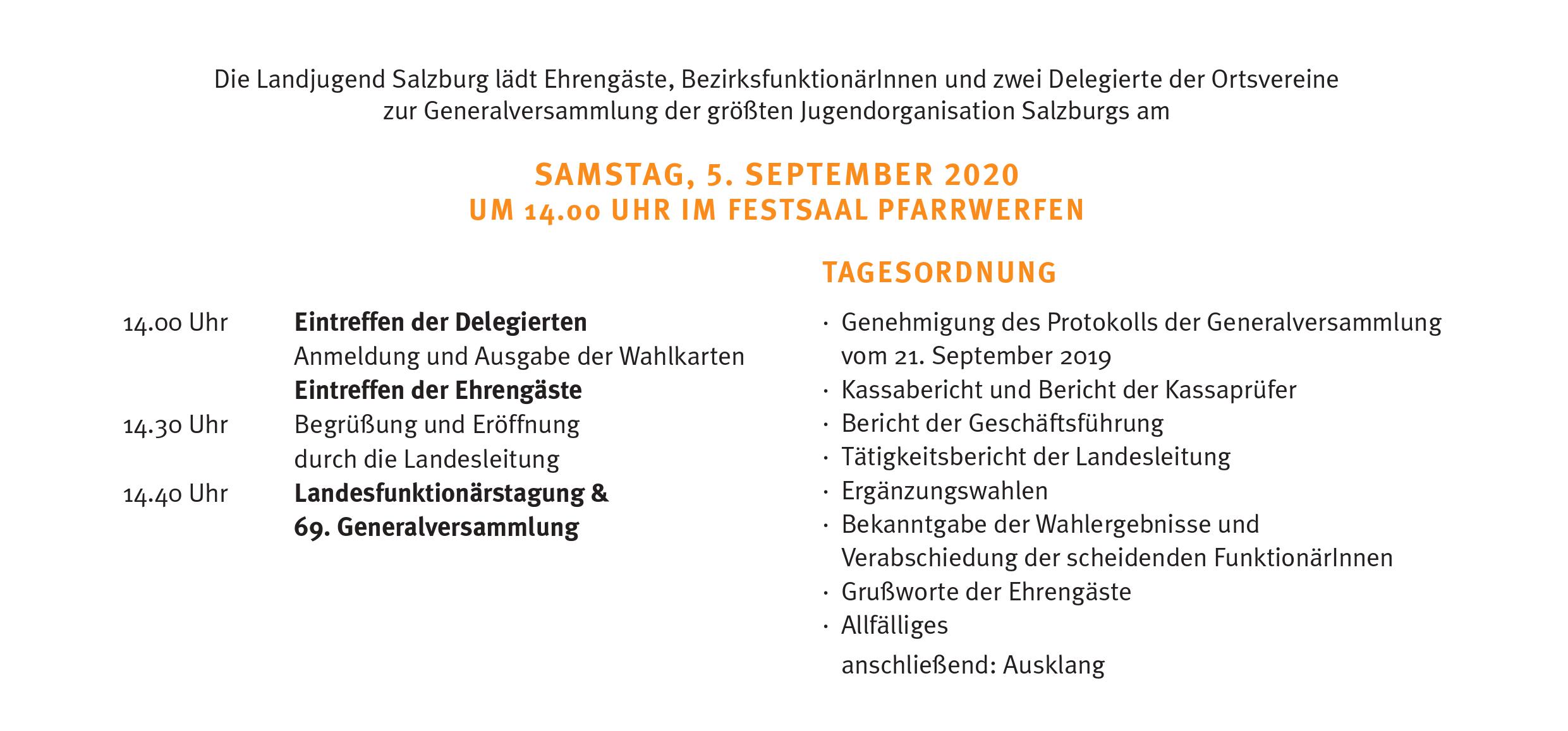 Ein außergewöhnliches Vereinsjahr der Landjugend Salzburg neigt sich dem Ende zu. Am Samstag, den 5. September 2020 findet die diesjährige Landesfunktionärstagung & 69. Generalversammlung der größten Jugendorganisation Salzburgs statt. In einer Zeit des Wandels begehen wir den Auftakt zu einem neuen, spannenden Landjugendjahr. Dazu laden wir alle Wahlberechtigten und Ehrengäste herzlich ein!