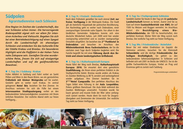 19. August: Der vierte Tag steht ganz im Zeichen der Landwirtschaft. Eine Besichtigung eines Saatzuchtbetriebes gibt uns ein Einblick in die Vermehrung von beliebten Getreidesorten. Am Nachmittag folgt die Besichtigung eines Biohofes mit Fleckviehhaltung und Ackerbau. Der restliche Tag kann wiederum zum Sightseeing in Breslau verwendet werden. 20. August: