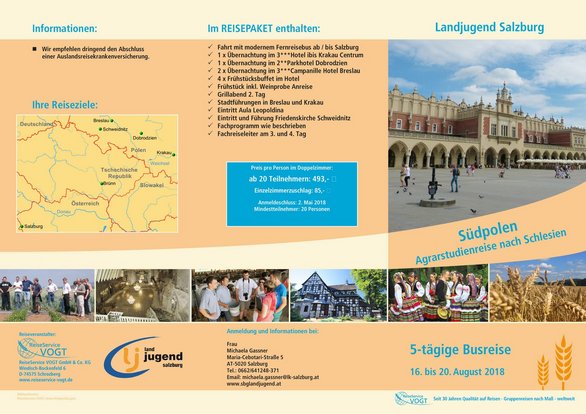Datum: 16. - 20. August 2018 Ihr plant mit eurer Ortsgruppe einen Ausflug, wisst aber noch nicht wohin? Dann haben wir das richtige für euch! Nach einer unvergesslichen Landesexkursion 2016 in die Toskana und 2017 in die Schweiz, führt uns dieses Jahr die Reise in den Osten von Europa – nach Polen! Polen ist besonders für seine vielseitige Landwirtschaft, die Kulturstädte wie Krakau und Breslau sowie seine prägende Geschichte bekannt!