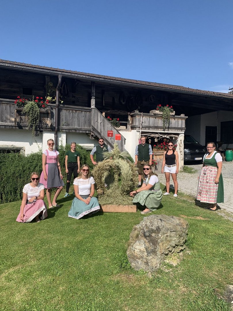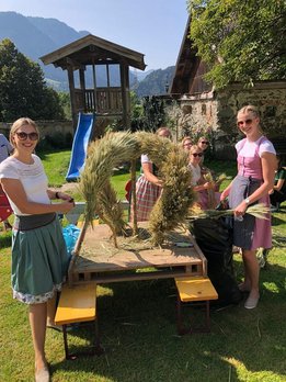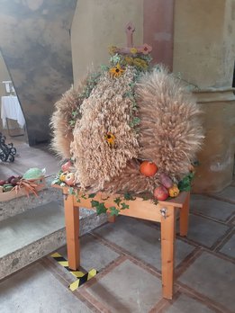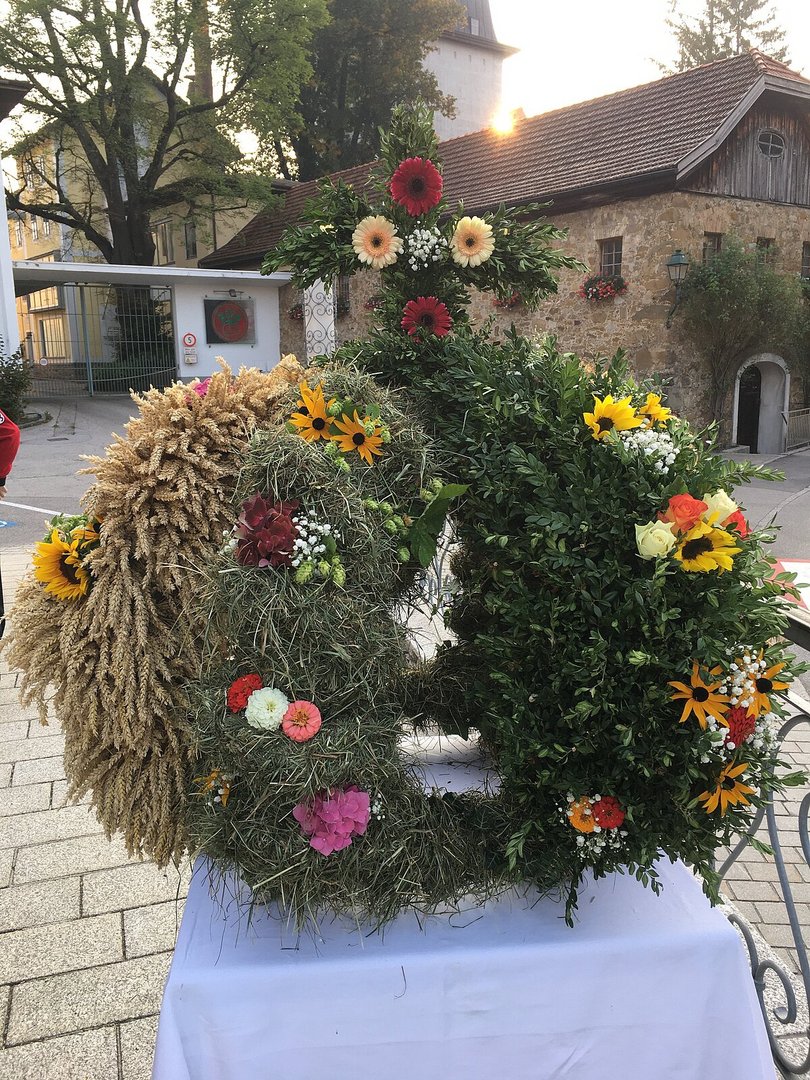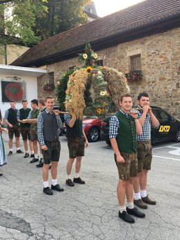 Das Jahr 2020 brachte den Landwirten, Getreidebauern, Ackerbauern, Weinbauern und Obst- und Gemüsebauern eine reiche Ernte und dies gehört natürlich mit einem Erntedankfest gefeiert, wenn auch heuer auf etwas andere Art und Weise als üblich. Das typische Brauchtum unserer Zeit entstammt dem bäuerlichen Arbeitsleben. War die Ernte eingebracht, banden Mägde einen Kranz aus geflochtenem Getreide und überreichten ihn mit der letzten Fuhre dem Bauern, der seinem Gesinde dafür ein Festessen servieren ließ. Aus dem Kranz entwickelte sich die kunstvoll gestaltete Erntekrone. Die Gestaltung lässt viel Spielraum zu. Eine Anleitung für eine gebundene Erntekrone gibt es eigentlich nicht. Üblich ist jedoch, dass Kronen aus einer geraden Anzahl an Strängen wie z.B. vier, sechs oder acht Ähren bestehen. Die Stränge werden von Ort zu Ort anders geschmückt. Die Kronengestelle bestehen meist aus Holz oder Metall. Vorwiegend sind die wichtigsten Getreidesorten Weizen, Gerste, Roggen und Hafer, mit Blumen und Früchten verziert. Immer öfters binden Orte die kein Getreide anbauen, die Erntekronen mit Heu, Hopfen, Efeu, Latschen, Buchs und vielem mehr als regional zur Verfügung stehende Grundlage. Somit wird die Ernte dieser Örtlichkeit wiedergespiegelt.