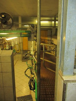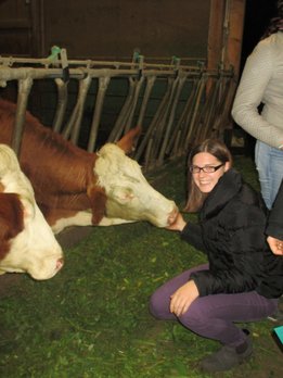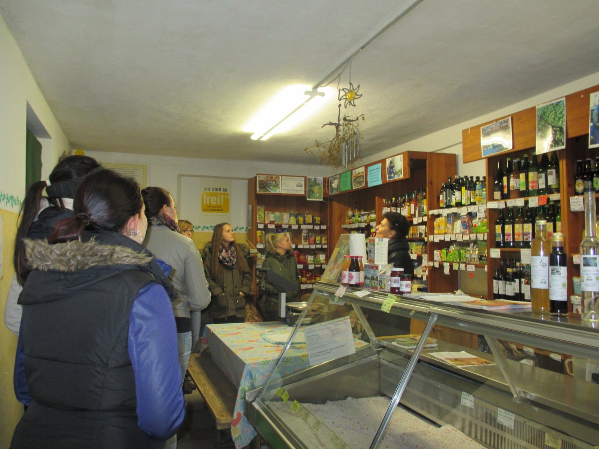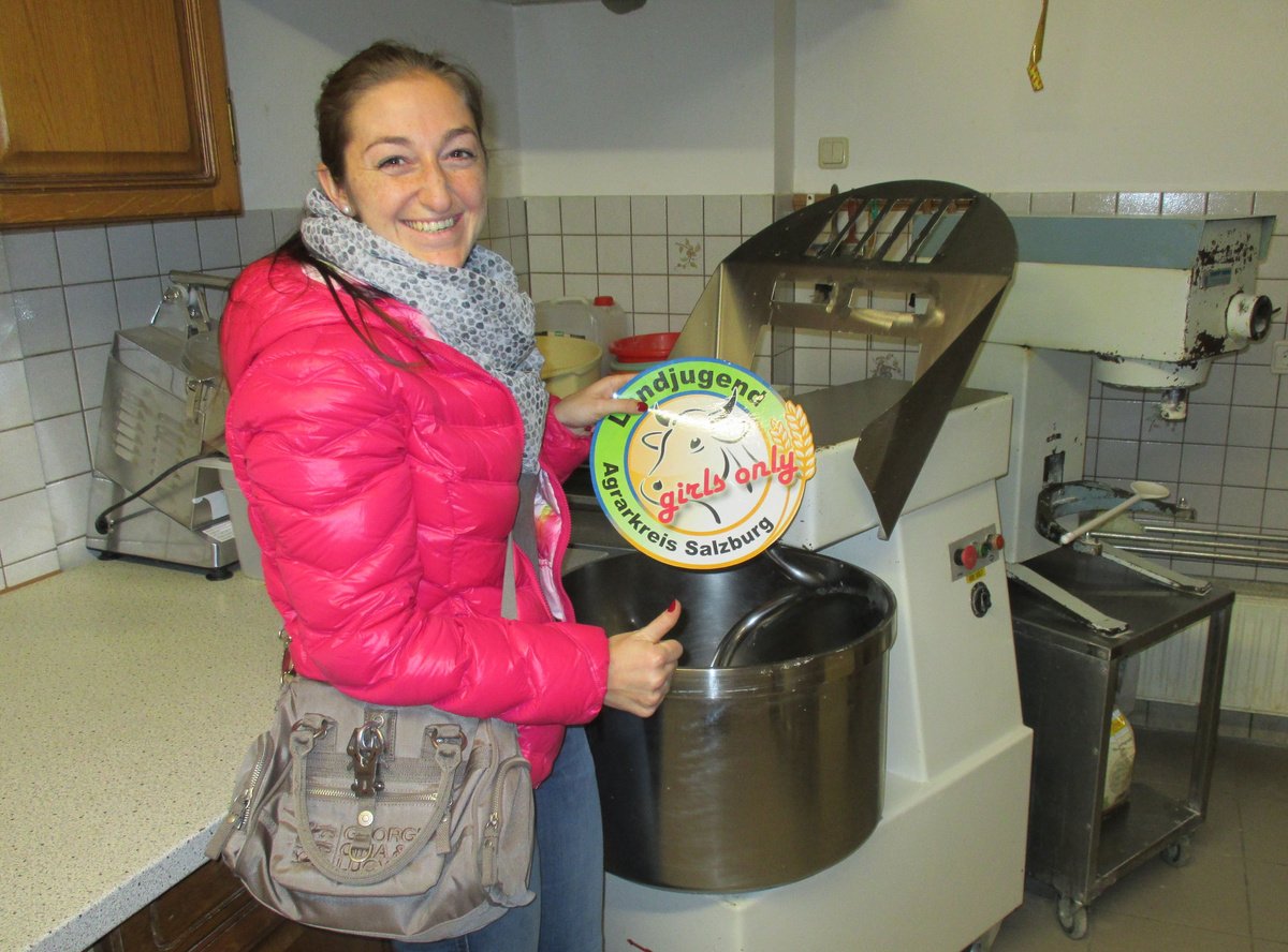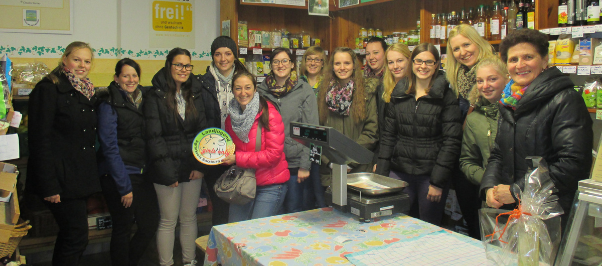 Die ausgebildete Natur- und Landschaftsführerin Maria Hofer führte die 13 wissbegierigen Damen durch ihren Betrieb. Der Erbhof "Joglbauerngut zu Hohengarten" ist seit 1776 im Besitz der Familie Hofer und liegt auf einer Hochfläche des Haunsbergrückens oberhalb der Trumer Seen. Seit 1979 werden 40 ha Boden nach den Richtlinien des organisch-biologischen Landbaus im Vollerwerb bewirtschaftet. Maria Hofer betonte, dass die Herausforderung einen landwirtschaftlichen Betrieb zu führen auch für die Frauen nicht selten körperliche Arbeit erfordert. „Das wichtigste ist jedoch die Ausbildung. Auch wenn man vorher etwas anderes gemacht hat, sollte sich jeder und jede ein fundiertes landwirtschaftliches Wissen aneignen.“ Der Hofladen ergab sich durch den Vorfall mit Tschernobyl. „Die Leute hatten Angst vor verstrahlten Lebensmitteln und fragten bei uns, ob sie Produkte kaufen könnten“ erinnert sich Maria Hofer. Später wurden feste Verkaufszeiten festgelegt und Produkte von anderen Landwirten ins Sortiment aufgenommen. Angebaut wird jegliches Gemüse außer Paprika, Tomaten und Gurken, zudem werden allerlei Frischmilch- und Essigprodukte produziert. Das Brot und die Mehlspeisen werden ausschließlich mit dem selbst angebauten Dinkel gebacken. Für die Verwertung der Magermilch bei der Erzeugung von Butter wurden drei Schweine eingestellt und die 70 Hühner am Hof sorgen für ausreichend Eier. „Der Hofladen ist zu einem Standbein geworden und nun bekommen wir Besuche aus aller Welt. Gerade letzte Woche war eine Gruppe aus Indien da“. Damit die Kunden auch sehen können wie es zu ihren Produkten kommt, ist ein Schaumelkstand errichtet worden.