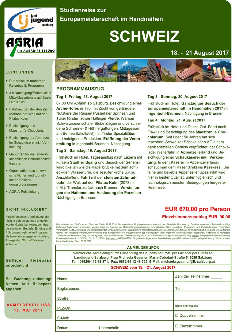 Von 18. bis 21. August 2017 besuchen wir abermals die Europameisterschaft im Sensenmähen. Nach den unvergleichlichen Erfahrungen im Baskenland (Spanien) und in der italienischen Toskana führt uns die Landeslehrfahrt 2017 in die Schweiz. Großes Highlight ist der Sensenmähwettbewerb im Land der amtierenden Europameisterin, genauer gesagt in Ingenbohl im Kanton Schwyz, am Vierwaldstättersee. Als besonderes Schmankerl erwarten die TeilnehmerInnen folgende Programmhighlights: