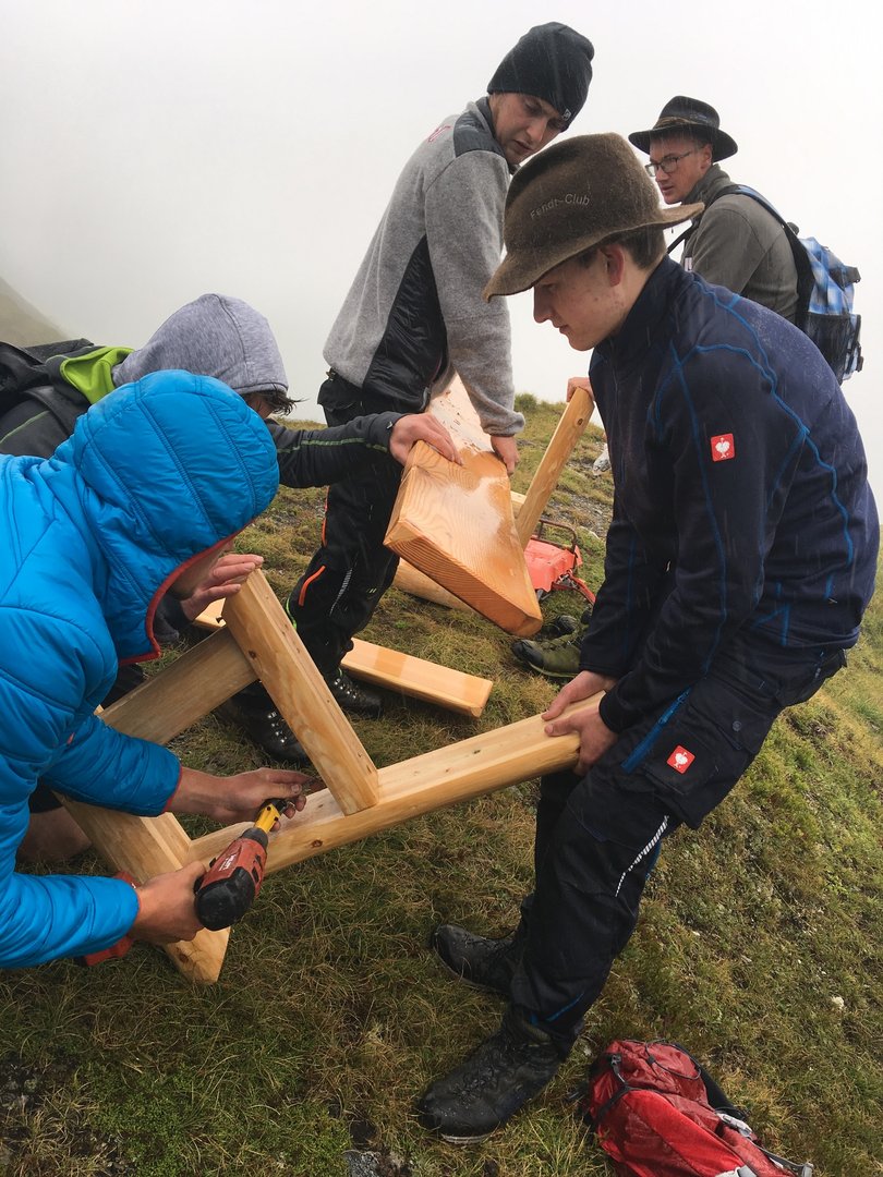 Am 12. August starteten sie bereits in den frühen Morgenstunden den Aufstieg in die Berge, Richtung Weißeck (2711m). Der Wettergott war leider nicht auf ihrer Seite, aber dadurch wollte sich niemand einschüchtern lassen. Die einzelnen Teile des Bankerl’s, sowie das Werkzeug befestigten sich die Jungs auf deren Rücken oder trugen es mit den Händen den Wandersteig hinauf. Nach 2 Stunden wurde das Ziel, die Riedingerscharte erreicht und das Bankerl konnte fertig montiert und aufgestellt werden. „Ein gemütliches Bankerl in den Bergen, mit super Aussicht - ein perfekter Platz zum Ausrasten und Genießen (:“, so die Ortsgruppenleiterin Petra Gruber.