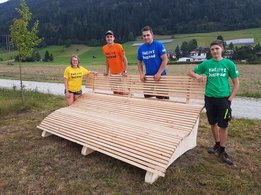 Auch in Unternberg wurde fleißig am Bankerl gearbeitet. Die Holzleisten waren schnell gefertigt und das Grundgerüst erstellt. Nach dem Motto „viele Hände schnell ein Ende“ konnte das Bankerl rasch fertig gestellt und am vorgesehenen Platz errichtet werden. „Das besondere an unserem Bankerl ist, dass wir uns an die Form einer Liege gehalten haben. Jedoch ist unser Bankerl gesamt 2,9 m lang und bietet ca. 5 Personen Platz zum Liegen“, so Gruppenleiter Michael Zehner. Das Bankerl soll nun Einheimischen sowie auch Touristen einen Platz bieten, die Aussicht und die Gegend an der Mur zu genießen, sich auszuruhen und zu entspannen.