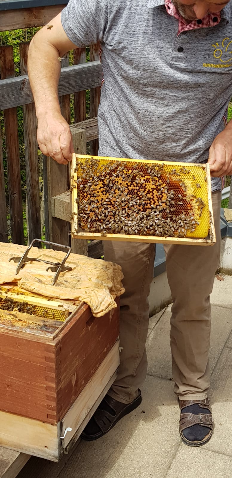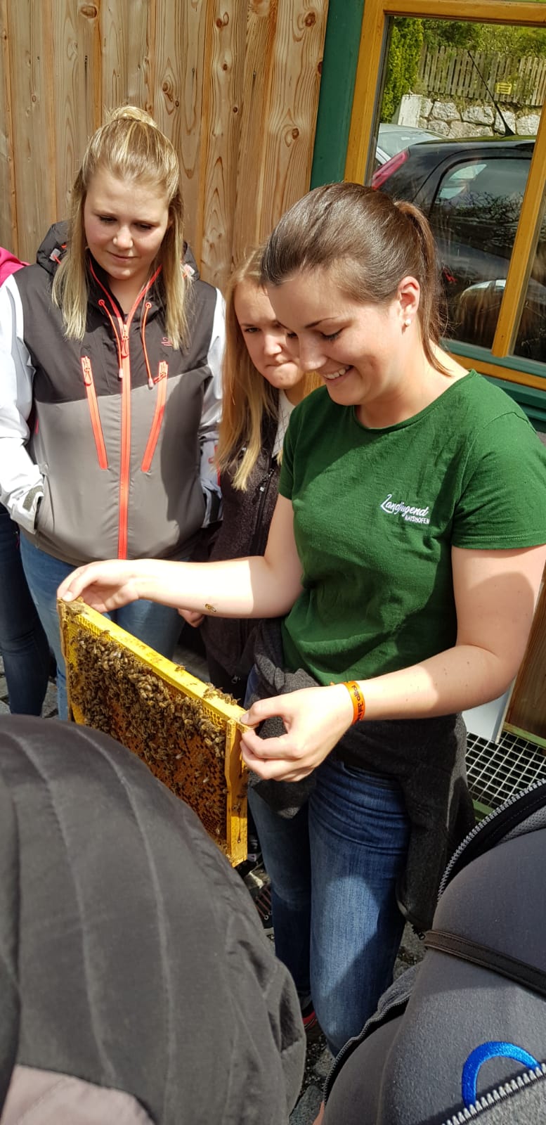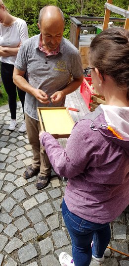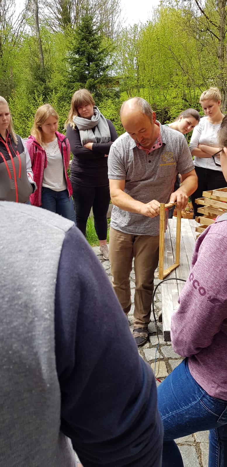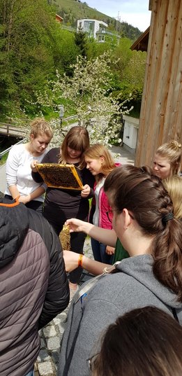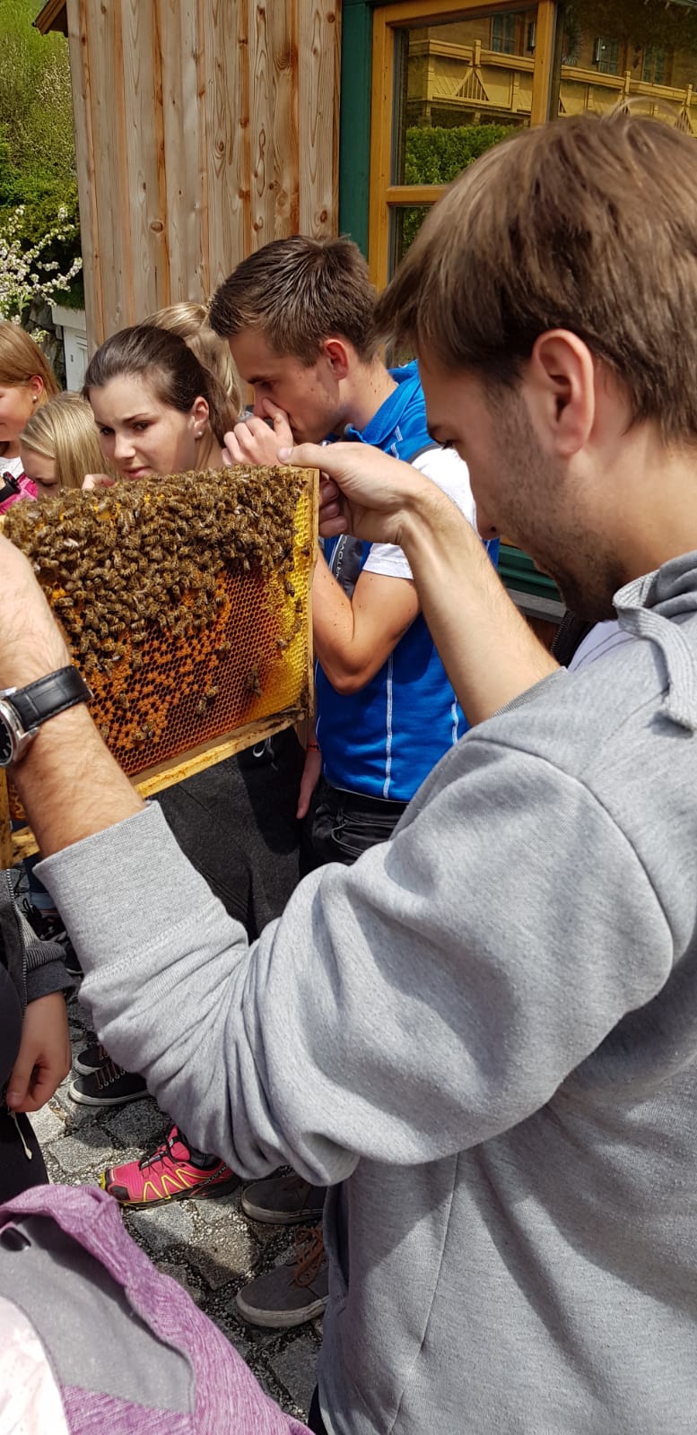 Am Samstag, den 11. Mai 2019 haben sich 20 interessierte Jugendliche der Landjugend Bezirk Pinzgau auf den Weg nach St. Georgen/Pzg. gemacht. Ziel waren die Bienenstöcke des Sunnseitimkers Franz Eder. St. Georgen/Pzg. Der als Sunnseitimker bekannte Franz Eder, beschäftigt sich schon seit rund 40 Jahren mit Bienen. Er besitzt 40 Stöcke mit Carnica Bienen, aufgeteilt auf drei Standorte. Sein Wissen gibt er im Unterricht an der Landwirtschaftlichen Fachschule Bruck weiter sowie bei verschiedenen Kursen. Da der Trend zur Haltung von Bienen derzeit ein Hoch erlebt, hat sich auch die Landjugend Bezirk Pinzgau für einen Kurs entschieden. Der Einladung sind zahlreiche Mitglieder gefolgt. „Ich habe erst vor kurzem mit dem Imkern begonnen und habe bereits ein paar Bienenstöcke. Von erfahrenen Imkern wie Franz Eder kann man einiges lernen und sich viele Tipps und Tricks holen“, erzählt Landesobmann-Stv. und begeisterter Imker Michael Egger. Um einen Bienenstock optimal versorgen zu können ist es wichtig, die grundlegenden Abläufe zu verstehen. Das Bienenvolk unterliegt einem ständigen Wandel. Eine Sommer-Arbeitsbiene erreicht durchschnittlich ein Alter von 35 Tagen. In den „Hauptarbeitszeiten“, im Sommer, tummeln sich ca. 40.000 Bienen in einem Stock. Die Arbeiterinnen die im Bienenstock überwintern, leben dagegen um einiges länger. Sie werden erst im Spätsommer geboren und überwintern bis ins Frühjahr. Zu dieser Zeit ist es im Bienenstock mit nur rund 8.000 Bienen verhältnismäßig ruhig. Das Volk ist in dieser Jahreszeit anzahlmäßig am schwächsten. Eine zentrale Frage, die die Teilnehmer beschäftigte war, wie viel der heurige Winter den Bienen abverlangt hat. „Die Bienen haben den strengen Winter heuer überraschend gut überstanden. Sie haben nur sehr wenig vom angebotenen Futter gebraucht. Ein langer schöner Herbst und genügend selbstgesammelten Honig der ihnen zur Verfügung steht hat die Bienen unterstützt“, erklärt Eder. Auch die Veredelungen des „Sunnseitimkers“ wurden unter die Lupe genommen. Das vielfältige Sortiment lässt keine Wünsche offen. Diverse Honigsorten wie der bekannte Waldhonig oder Cremehonig sind neben speziellen Variationen mit Haselnüssen, Aroniaberen oder Salbei zu finden. Auch verschiedene Metsorten, Lippenpflege, Bienenwachswickel und Propolistropfen werden aus den Urprodukten der Bienen hergestellt. Ein besonderer Tipp vom Fachmann gegen Bienenstiche: Nie den Stachel gerade aus der Haut ziehen. Besser mit dem Fingernagel zur Seite „wischen“. So gelangt viel weniger Bienengift in die Wunde und es schwillt nicht so sehr an.