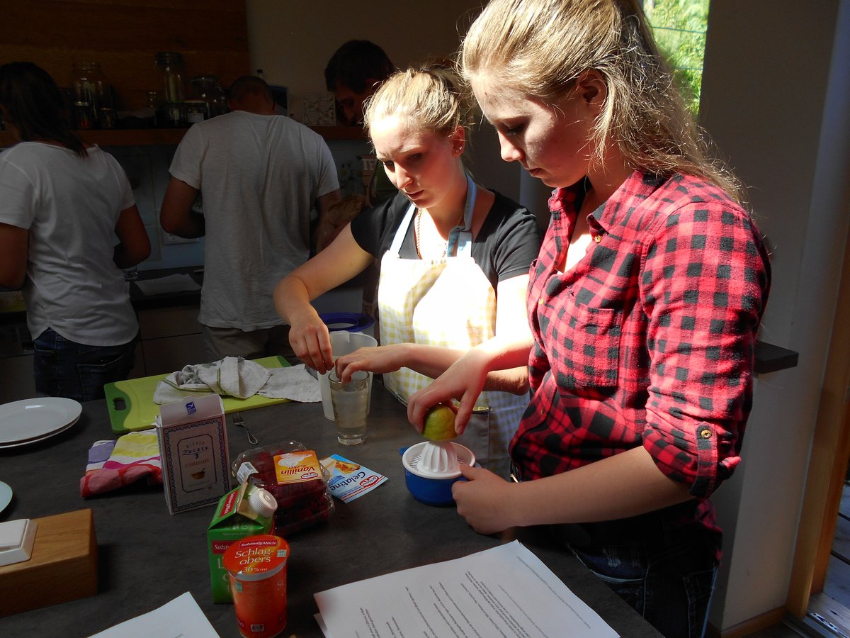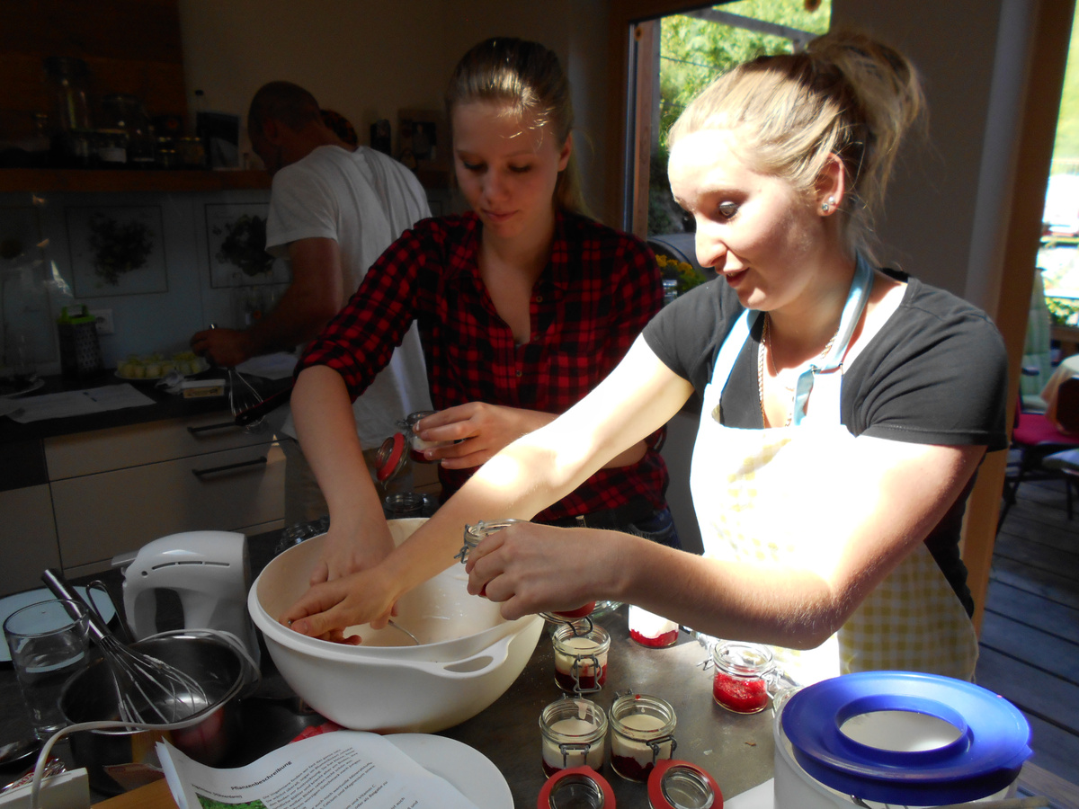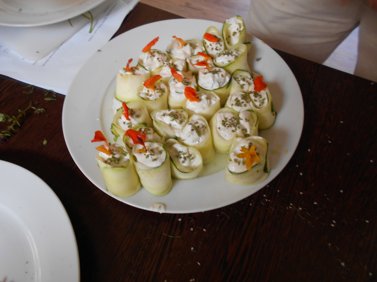 Als Hauptspeise wurde ein Schweinefilet mit Kräuterhaube in Blätterteig aufgetischt, dazu gab es Zuchiniröllchen mit Frischkäsefüllung und Kartoffeln. Den krönenden Abschluss machte ein Buttermilchmousse mit Rosenblüten und marinierten Himbeeren, dazu gab es Biskuithippen. Weiters wurde ein Mädesüßblütenlikor und Rosenblütenzucker zubereitet, welche als Belohnung mit nach Hause genommen werden durfte.