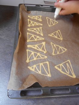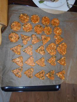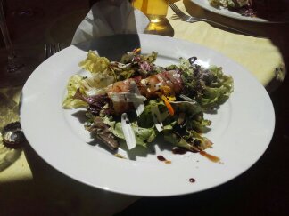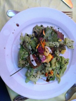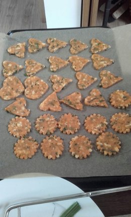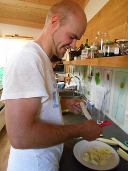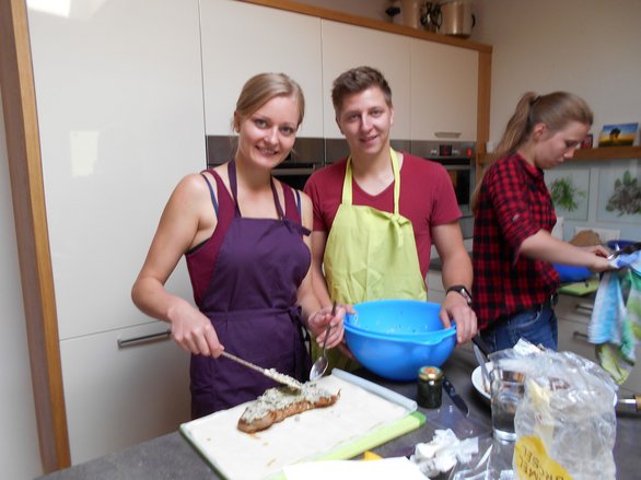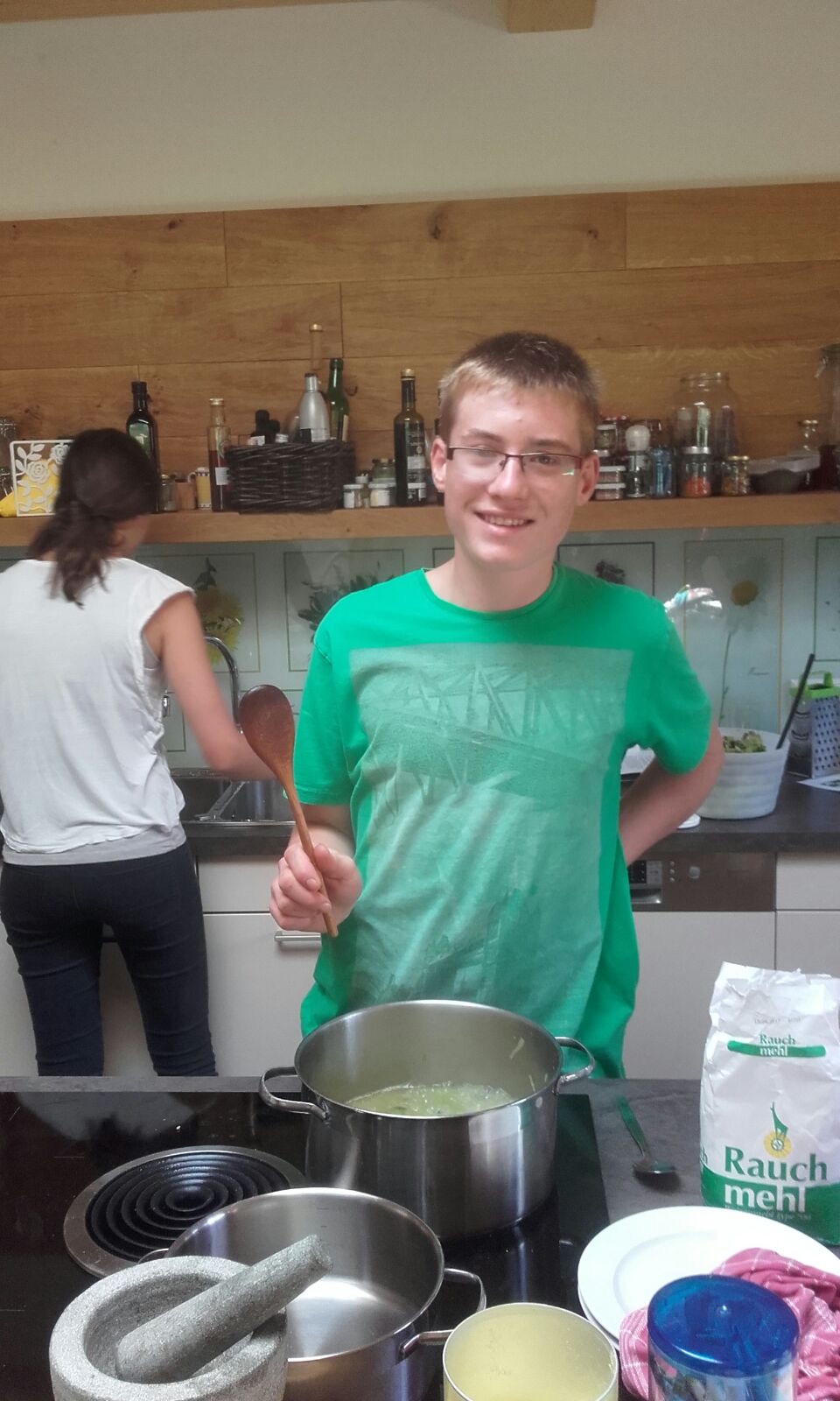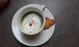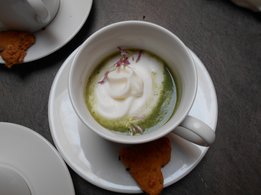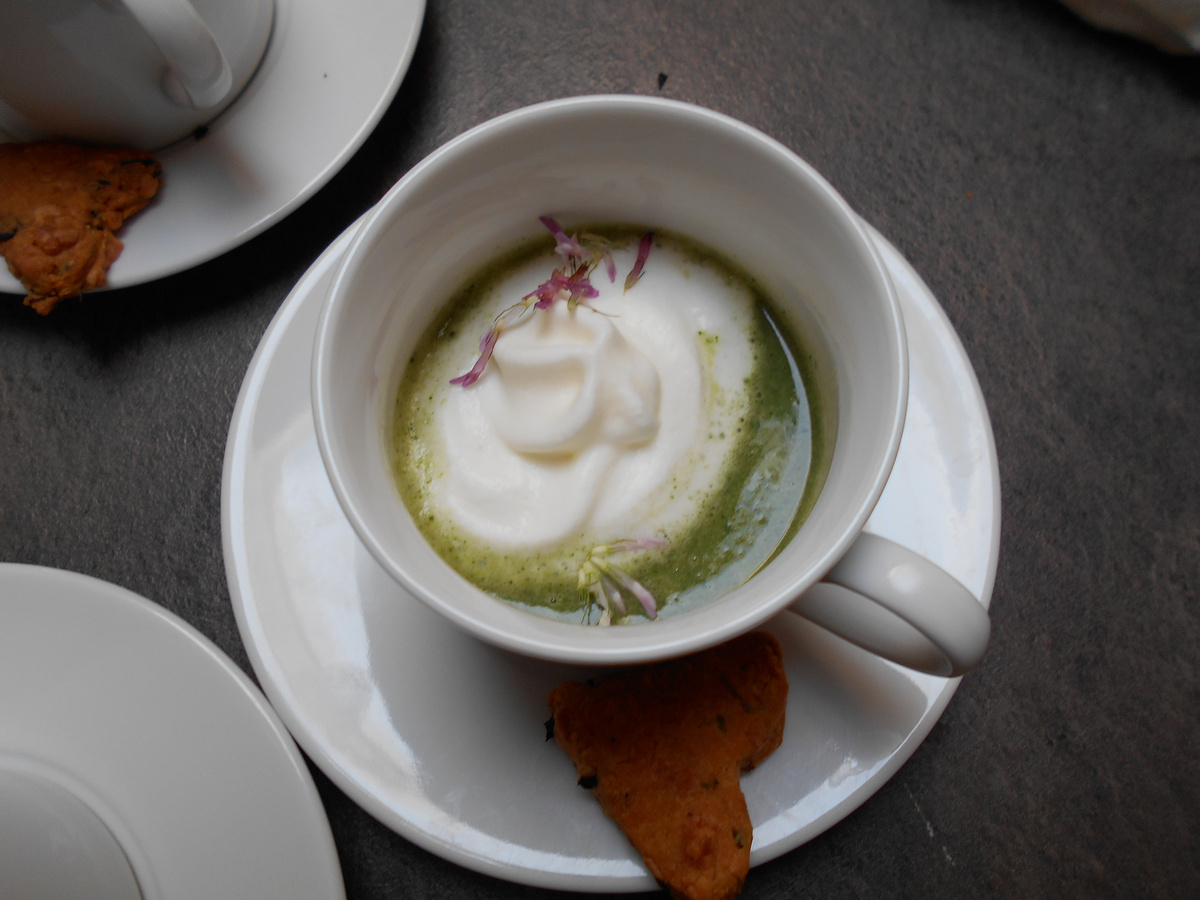 Nachdem genügend Wildkräuter gesammelt wurden, startete die 9-köpfige Truppe mit dem Kochen. Vorbereitet wurden ein 4-Gänge-Menü sowie ein Aperitif. Den Menüstart machte eine Frühlingskräutercremesuppe mit Mürbe Käse-Kräuterblumen, gefolgt von einem Wildkräutersalat mit Scharfgarbenspieße und Frischkäse.
