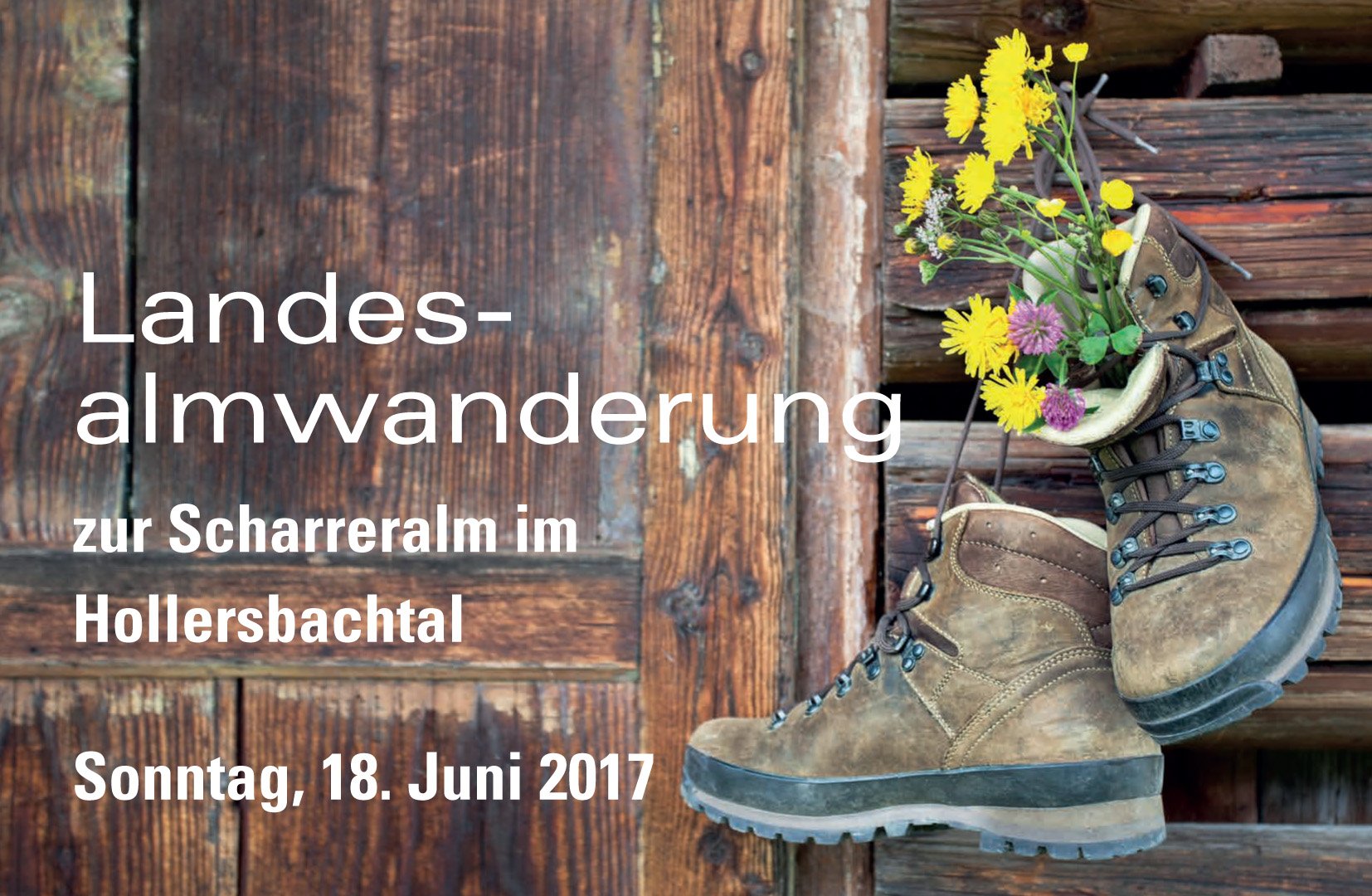 Am Sonntag, 18. Juni 2017 findet die Landesalmwanderung zur Scharreralm im Hollersbachtal in Hollersbach statt. Im Hollersbachtal befinden sich mehrere Milchkuhalmen. Auf der Scharreralm werden Milchwirtschaft mit Pinzgauer Rindern, eine Jungviehalpung auf der Hochalm, eine Almhüttenvermietung und ein gemeinsames Wasserkraftwerk für sechs Almen betrieben.