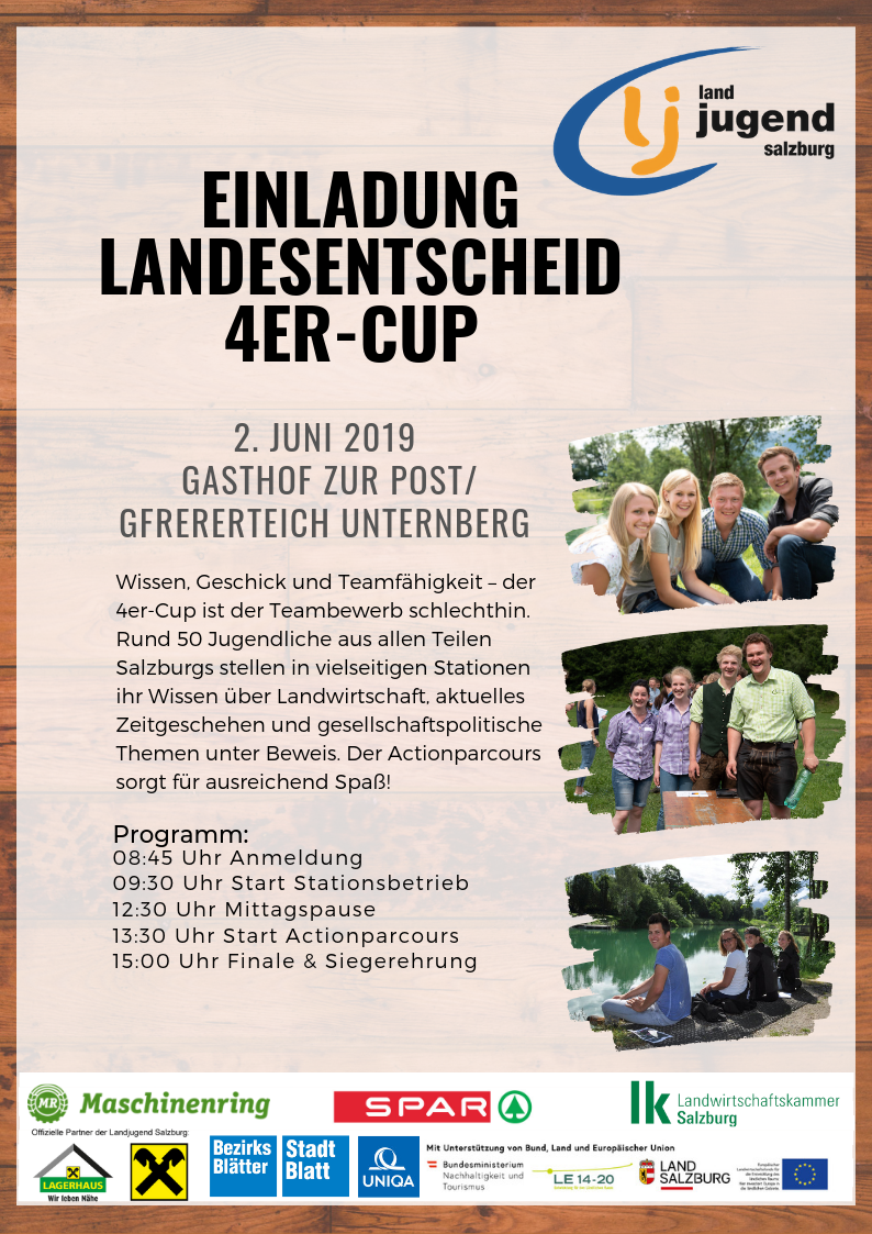 WAS: LANDESENTSCHEID 4ER-CUP WANN: 2. JUNI 2019 WO: GFRERETEICH/GASTHOF ZUR POST UNTERNBERG (BEZIRK LUNGAU) WER: DIE BESTEN 3 4ER-CUP TEAMS AUS JEDEM BEZIRK Mehr als 50 Jugendliche aus allen Bezirken stellen beim diesjährigen Landesentscheid 4er-Cup und am 2. Juni 2019 ihr Wissen über die Vielfalt unserer Landwirtschaft, über aktuelles Zeitgeschehen, gesellschaftspolitische Themen und ihr Geschick unter Beweis. Was ist der Landesentscheid 4er-Cup?