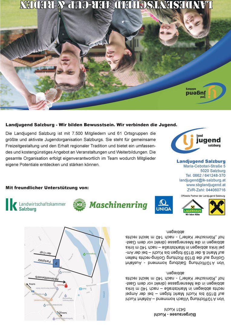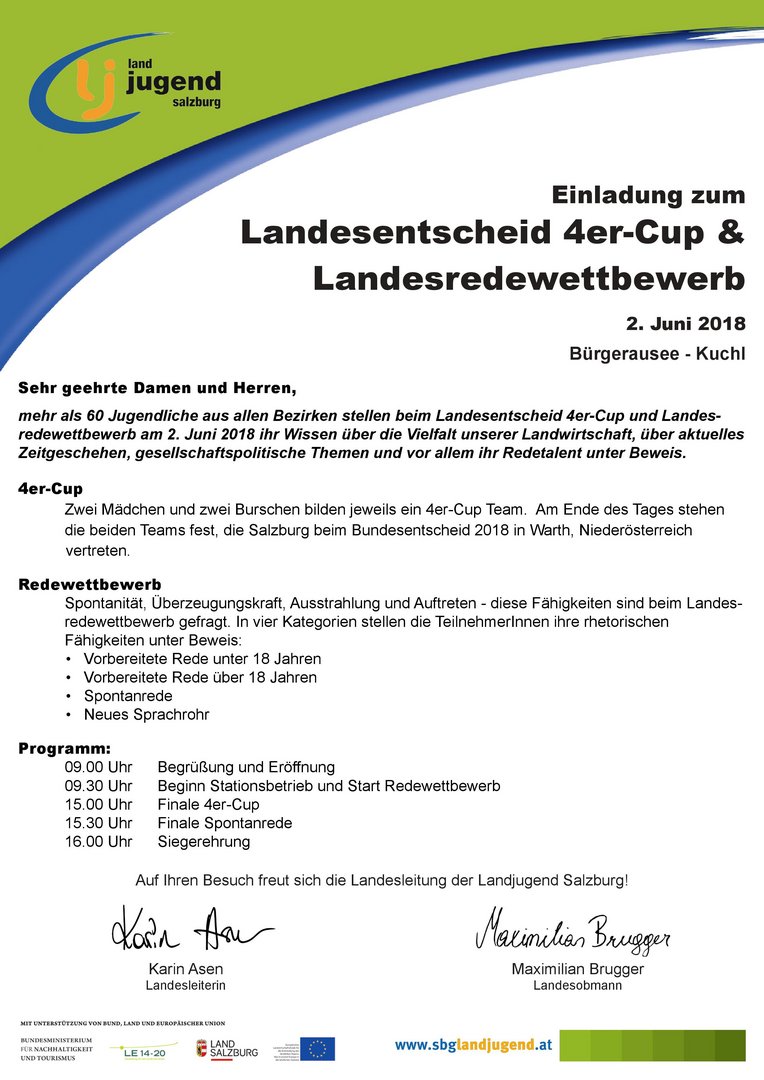 WAS: LANDESREDEWETTBEWERB UND LANDESENTSCHEID 4ER-CUP WANN: 2. JUNI 2018 WO: BÜRGERAUSEE & PFARRAMT KUCHL (BEZIRK PONGAU-TENNENGAU) WER: REDETALENTE AUS GANZ SALZBURG Mehr als 60 Jugendliche aus allen Bezirken stellen beim diesjährigen Landesentscheid 4er-Cup und Landesredewettbewerb am 2. Juni 2018 ihr Wissen über die Vielfalt unserer Landwirtschaft, über aktuelles Zeitgeschehen, gesellschaftspolitische Themen und vor allem ihr Redetalent unter Beweis. Landesredewettbewerb Die TeilnehmerInnen können in vier verschiedenen Kategorien antreten: