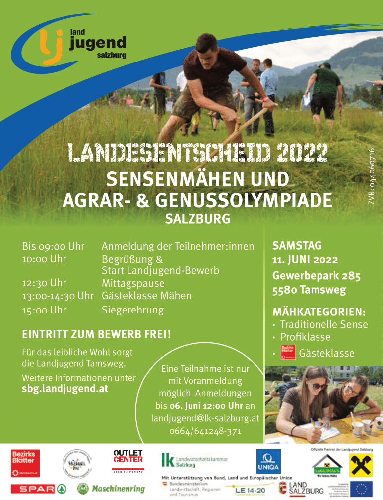 Heiße Duelle und ein spannender Wettkampf sind am Samstag, den 11. Juni 2022 beim Landesentscheid Sensenmähen und der Agrar- & Genussolympiade der Landjugend Salzburg garantiert. Salzburgs beste Mäher:innen kämpfen um den Landesmeistertitel.Genauso treffen sich die schlausten Köpfe im Agrar- und Genussbereich um ihr Wissen zu messen.