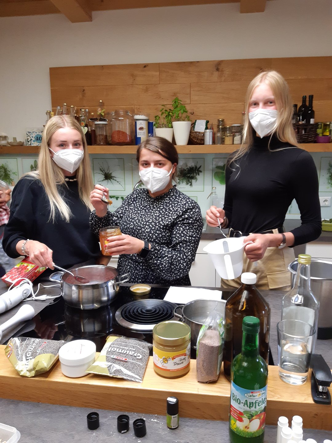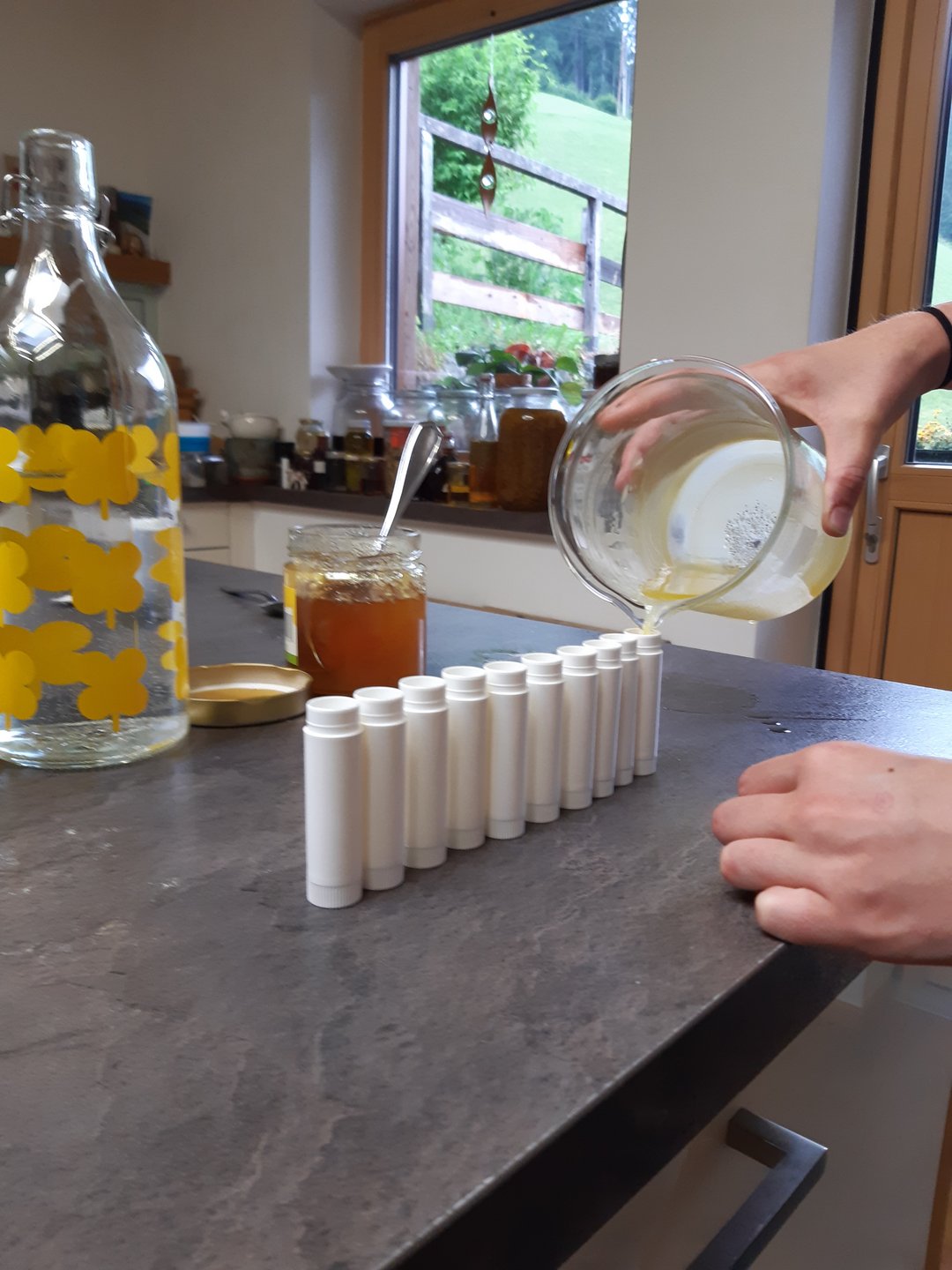 Auch bei der Naturkosmetik spielt Honig und Honigwachs eine große Rolle. Die Teilnehmer bekamen von Heidi Huber einen Einblick in die Kosmetikherstellung. Lippenbalsam, Duschgel, Bodybutter und vieles mehr wurde von den Mädchen selbst hergestellt.