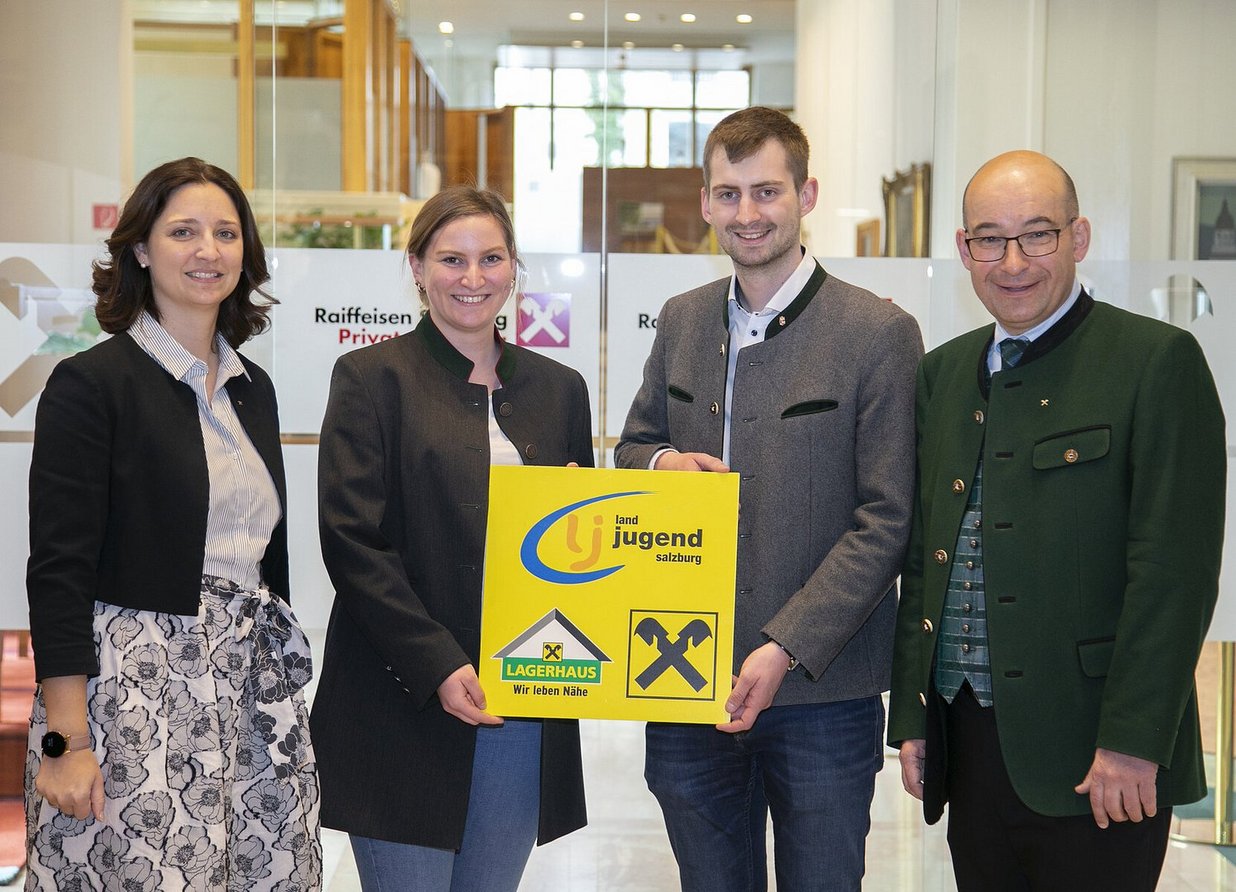 Im Bild: Dir. MMMag. Dr. Anna Doblhofer-Bachleitner (Raiffeisen Salzburg), Geschäftsführerin Katharina Hangöbl mit Landesobmann Markus Aigner der Landjugend Salzburg und Michael Porenta (Raiffeisen Salzburg).