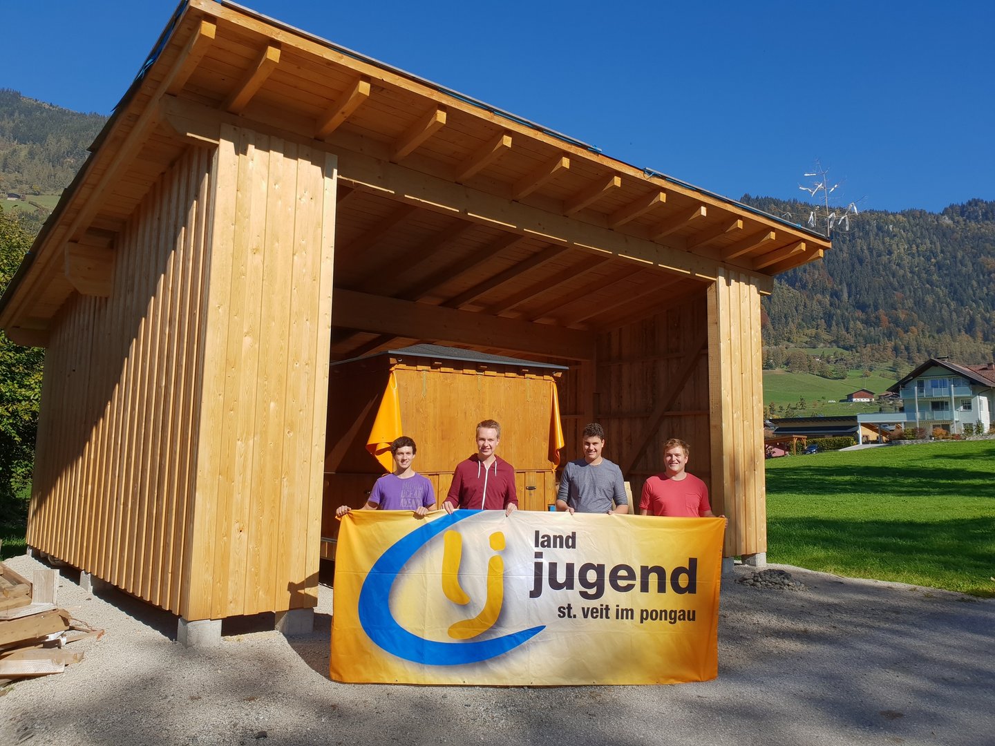 Die Jugend braucht Raum, um sich entfalten zu können. In der Gemeinde St. Veit im Pongau hat die Landjugend sowohl gesellschaftlich als auch materiell viel Raum erhalten. Durch die Unterstützung der Gemeinde konnte vor einigen Jahren bereits ein Landjugendraum verwirklicht werden, um einen Treffpunkt für die Jugendlichen zu schaffen. Nun wurde noch mehr Platz geschaffen. St. Veit. „Im Laufe der Zeit sammelt sich allerhand Material für diverse Veranstaltungen und Projekte an. Oftmals müssen diese dann ungeschützt vor Wind und Wetter oder Zuhause bei mehreren Ortsgruppenmitgliedern gelagert werden. Der Wunsch nach einem geeigneten Unterstand wurde immer größer“, erklärt Projektleiter und Ortsgruppenobmann Martin Gschwandtl. Da die Landjugendmitglieder in allen Berufssparten vertreten sind, konnte der Bau vom Fundament bis zur Fertigstellung ohne Fremdhilfe in über 210 ehrenamtlichen Arbeitsstunden realisiert werden. „Besonders der Zusammenhalt zwischen den jungen und den erfahreneren Mitgliedern in der Ortsgruppe wurde durch das Projekt gestärkt“, so Martin. Den Baugrund erhielt die Landjugend St. Veit von der Erzdiözese Salzburg. „Wir freuen sehr über die gute Zusammenarbeit mit unserem Dechant. Mag. Alois Dürlinger und sprechen dafür ein großes Danke aus“, so Gschwandtl. Der Bau des Unterstands ist gleichzeitig das Abschlussprojekt für den LFI-Zertifikatslehrganges JUMP der Landjugend Salzburg. Auf vier Module aufgebaut, beschäftigt sich JUMP (Junge, unschlagbar motivierte Persönlichkeiten) mit Rhetorik und Teambildung, mit Projektmanagement, Öffentlichkeitsarbeit und Veranstaltungsplanung. Die gelernten Fähigkeiten werden anschließend bei der Planung und Durchführung eines eigenen Projektes angewandt und gefestigt. Den Abschluss bildet die Projektpräsentation, bei der die TeilnehmerInnen ihr Projekt einer Jury präsentieren.