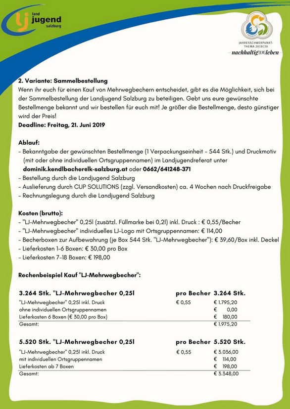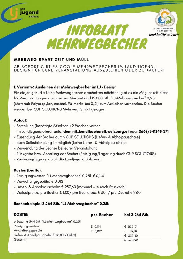 Mehrwegbecher im Landjugend-Design Regionalität und achtsamer Umgang mit vorhandenen Ressourcen sind Themen, die in Zeiten der Konsumwirtschaft immer wichtiger werden. Parallel dazu wächst ein weiterer essenzieller Begriff, der dafür sorgen soll, dass sich auch Generationen nach uns noch an der farbprächtigen Welt beglücken können. Meist versteht man unter Nachhaltigkeit hauptsächlich einen achtsamen Umgang mit Natur und Umwelt. Die Nachhaltigkeit gibt allerdings noch mehr her: Neben einer stabilen Wirtschaft ist auch ein gesundes Zusammenleben einer Gesellschaft essenziell, um Hand in Hand in eine erfolgreiche Zukunft blicken zu können. Daher gibt es im Rahmen unseres Jahresschwerpunktthemas „nachhaltig[ER]leben“ coole Mehrwegbecher im Landjugend-Design für eure Veranstaltung auszuleihen oder zu kaufen. Nähre Infos über die beiden Möglichkeiten erhältst du im Landjugendreferat unter dominik.kendlbacher(at)lk-salzburg.at oder 0662/641248-371 und im nachfolgenden Infoblatt. Infoblatt_Mehrwegbecher.pdf