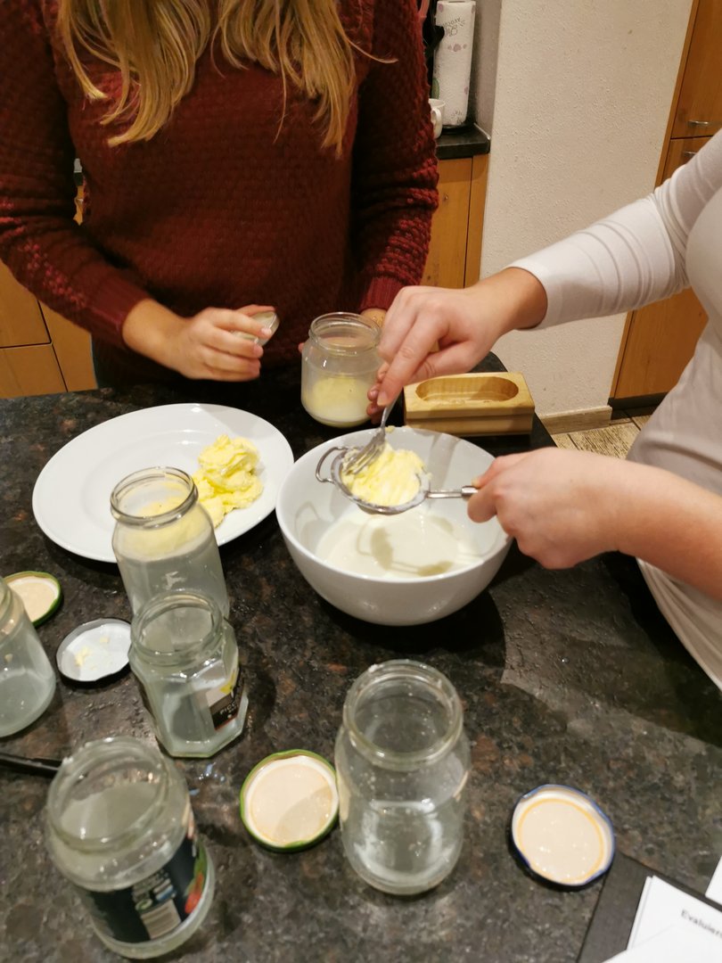 Salzburg. Joghurt, Butter, Topfen, Frischkäse – lauter unterschiedliche Produkte, aus demselben Rohstoff – Milch. Doch wie wird die Milch zum Joghurt? Was muss man dabei beachten, wenn man selbst Frischkäse herstellt und wann weiß ich, ob meine hausgemachte Butter fertig gerührt ist? All diese Fragen beantwortete uns Frau Carmen Glück vergangenen Montag im Zuge des Milchverarbeitungskurses. Doch natürlich wurde nicht nur lange um den heißen (Milch)Brei geredet, sondern auch fleißig angepackt. So verarbeiteten wir an einem Abend kurzerhand knappe 30 Liter Milch zu Joghurt, Frischkäse, Cottage-Cheese, Mozzarella und Topfen. „Das einzige was man hierbei können ‚muss‘, ist die Milch zum schlecht-werden bringen, was anderes ist das nicht“, so die Kursleiterin. Sie führte uns mit viel Humor, Geschick und Können durch den Abend, den wir mit einer abschließenden Jause unserer selbstgemachten Produkte ausklingen ließen.