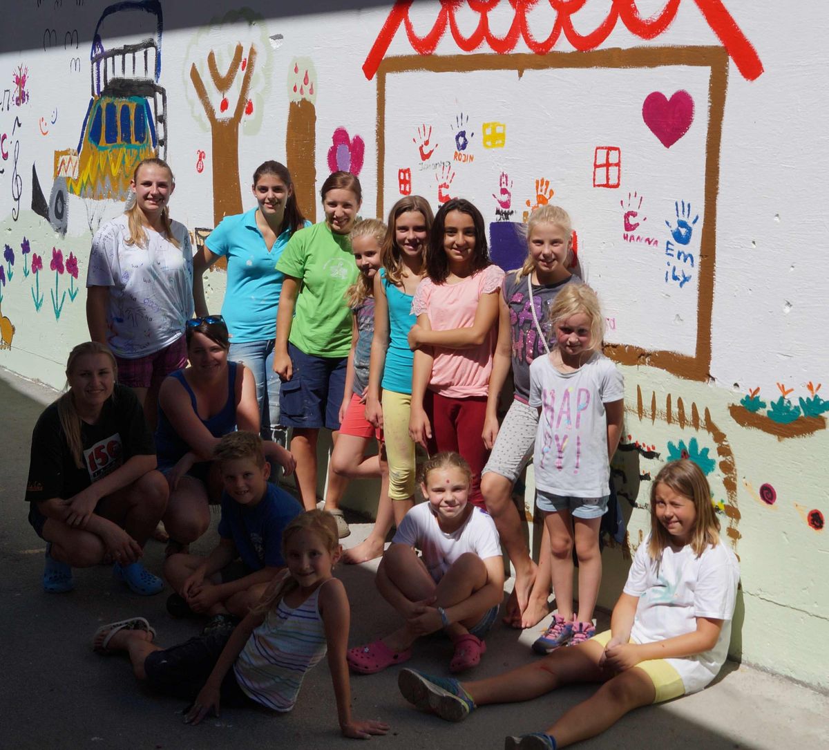 Weiters organisierte die Landjugend Köstendorf einen besonderen Programmpunkt im Ferienkalender der Gemeinde. Mit 14 Kindern nahm die Ortsgruppe Pinsel und Farbe in die Hand und verschönerte eine Wand mitten am Dorfplatz. Die Kinder stürzten sich ins Abenteuer und ließen ihrer Kreativität freien Lauf. Tiere, Menschen, Blumen, Häuser, sogar ein großes Safari-Auto können nun bewundert werden. Nach dem Malen gab es einen gesunden Imbiss, danach durfte sich noch jedes Kind mit ihrem/seinem Handabdruck auf der kunterbunten Wand verewigen.