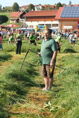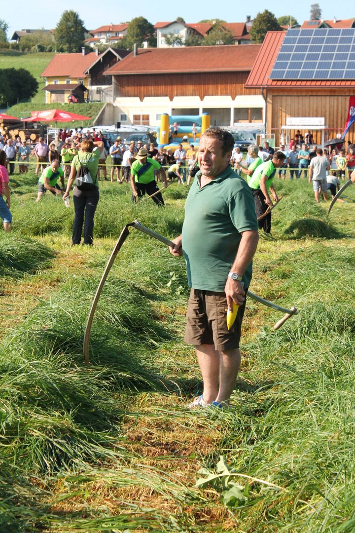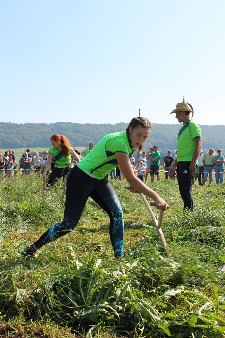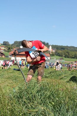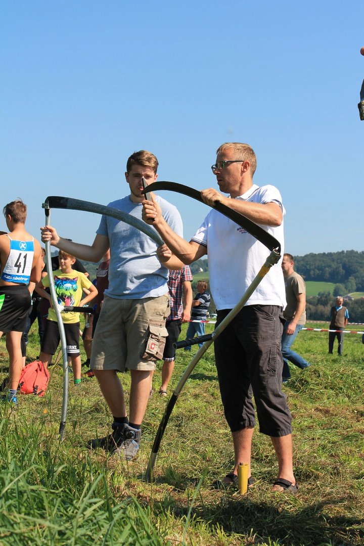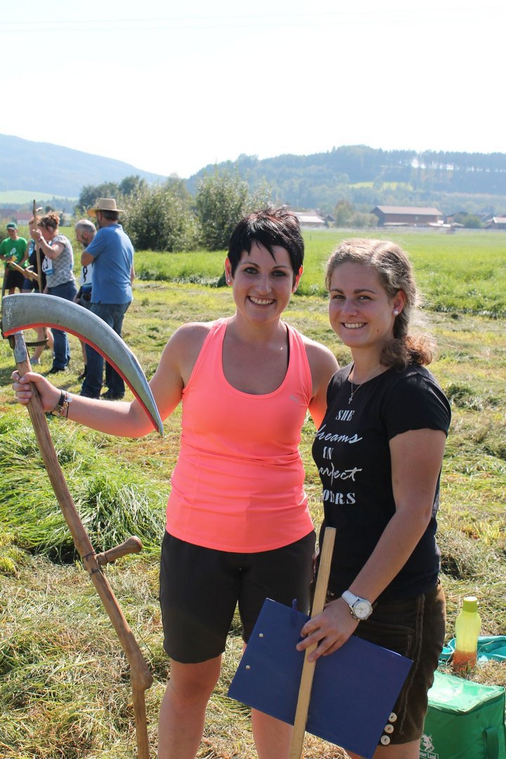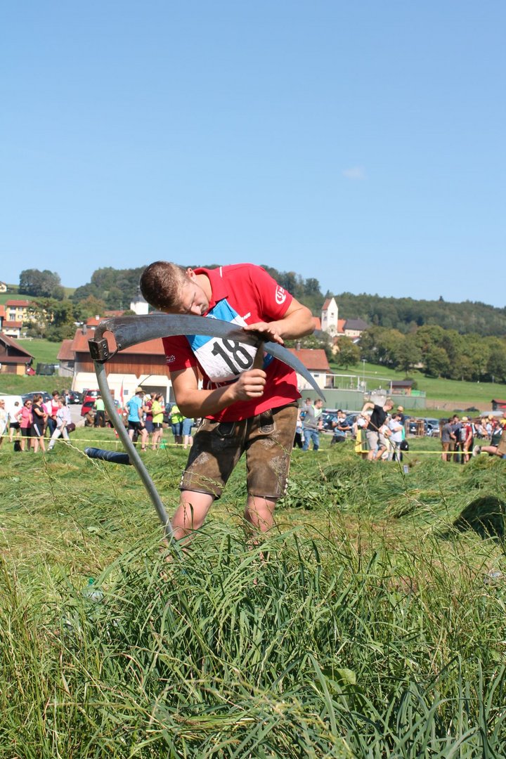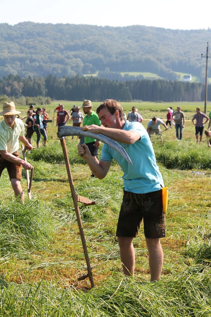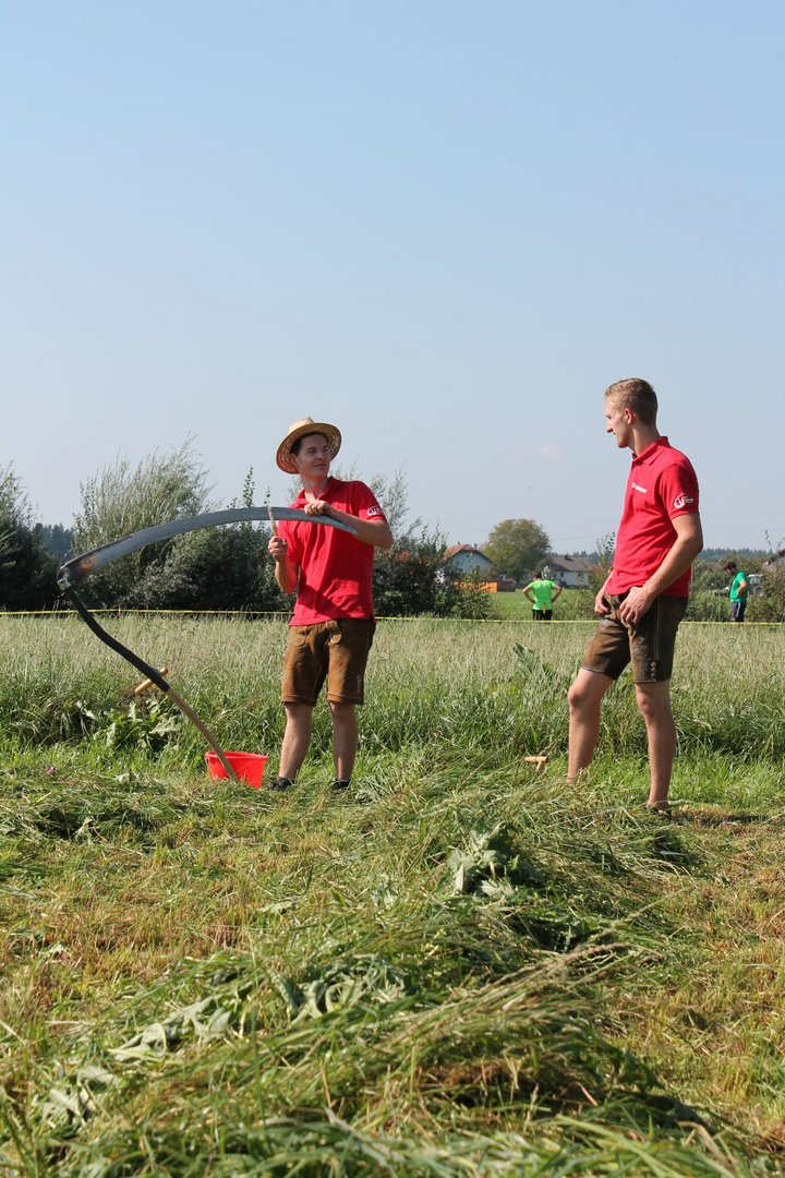 Am Sonntag, den 16. September 2018 fand das Österreich-Bayerische Mannschaftsmähen in Michaelbeuern statt. Über 160 TeilnehmerInnen aus der Schweiz, Slowenien, dem Baskenland, Südtirol und Österreich kämpften um den Meisterschaftstitel. Anders als bei den Landes- oder Bundesentscheiden der Landjugend wird beim Österreich-Bayerischen Mannschaftsmähen nicht einzeln sondern in 4er-Teams gestartet. In vier verschiedenen Kategorien kann teilgenommen werden. Die Königsklasse Herren (Sensenblattlänge über 90 cm) mäht dabei eine Fläche von 10 x 20 m und die Damen 8 x 15 m. In dieser Kategorie kommen Sensen bis zu 135 cm zum Einsatz. In der Allgemeinen Klasse (Sensenblattlänge unter 90 cm) sind Flächen von 8 x 15 m für die Herren und 6 x 10 m für die Damen zu mähen. „Auf ein gegebenes Signal beginnt der 1. Mäher der jeweiligen Mannschaft mit dem Mähen. Sobald dieser die entsprechende Markierung, die halbe Strecke der Parzellenlänge, mit der Sense erreicht hat, gibt ein zugeteilter Zeitnehmer ein deutliches Handzeichen zum Start für den zweiten Mäher der Mannschaft. Dies wiederholt sich auch bei dem dritten und vierten Mäher. Nachdem der letzte Mäher das Mähen beendet hat, wird das Ende durch ein Handzeichen angezeigt“, erklärt Teilnehmer und Organisator Matthias Huber (Landjugend Michaelbeuern) den Ablauf des Mannschaftsmähens. „Eine weitere Besonderheit des Wettbewerbes ist die Bewertung der Mahd. Diese muss gerade und gleichmäßig verlaufen. Ist die Mahd bewertet, wird das Mähgut entfernt und die Schiedsrichterkommission, bestehend aus vier Schiedsrichtern, bewertet dann die Sauberkeit“, erklärt Chef-Juror Andre Pertiller (Eugendorf) weiter.
