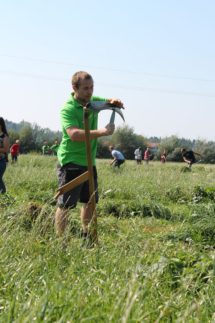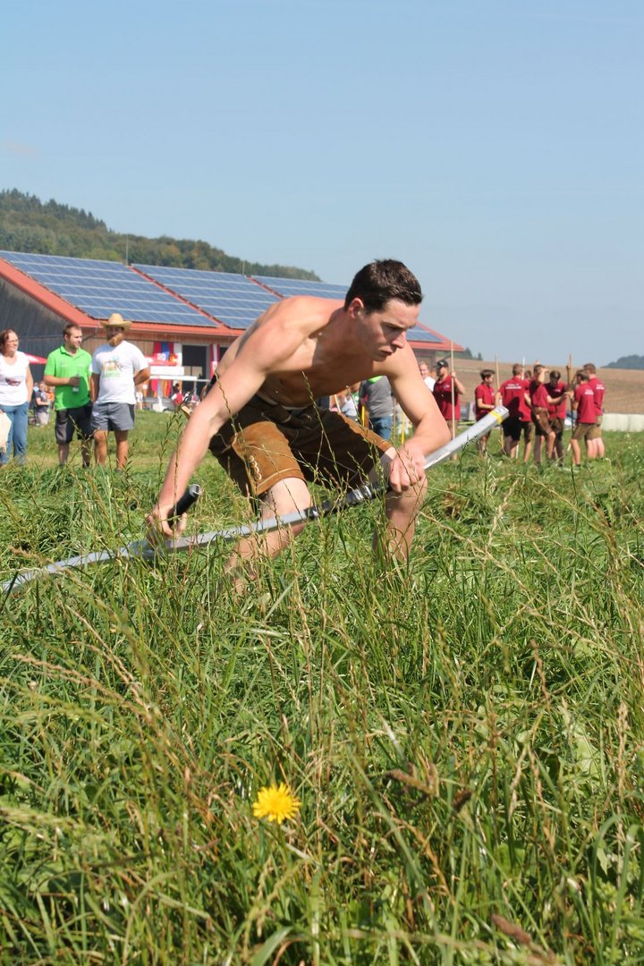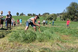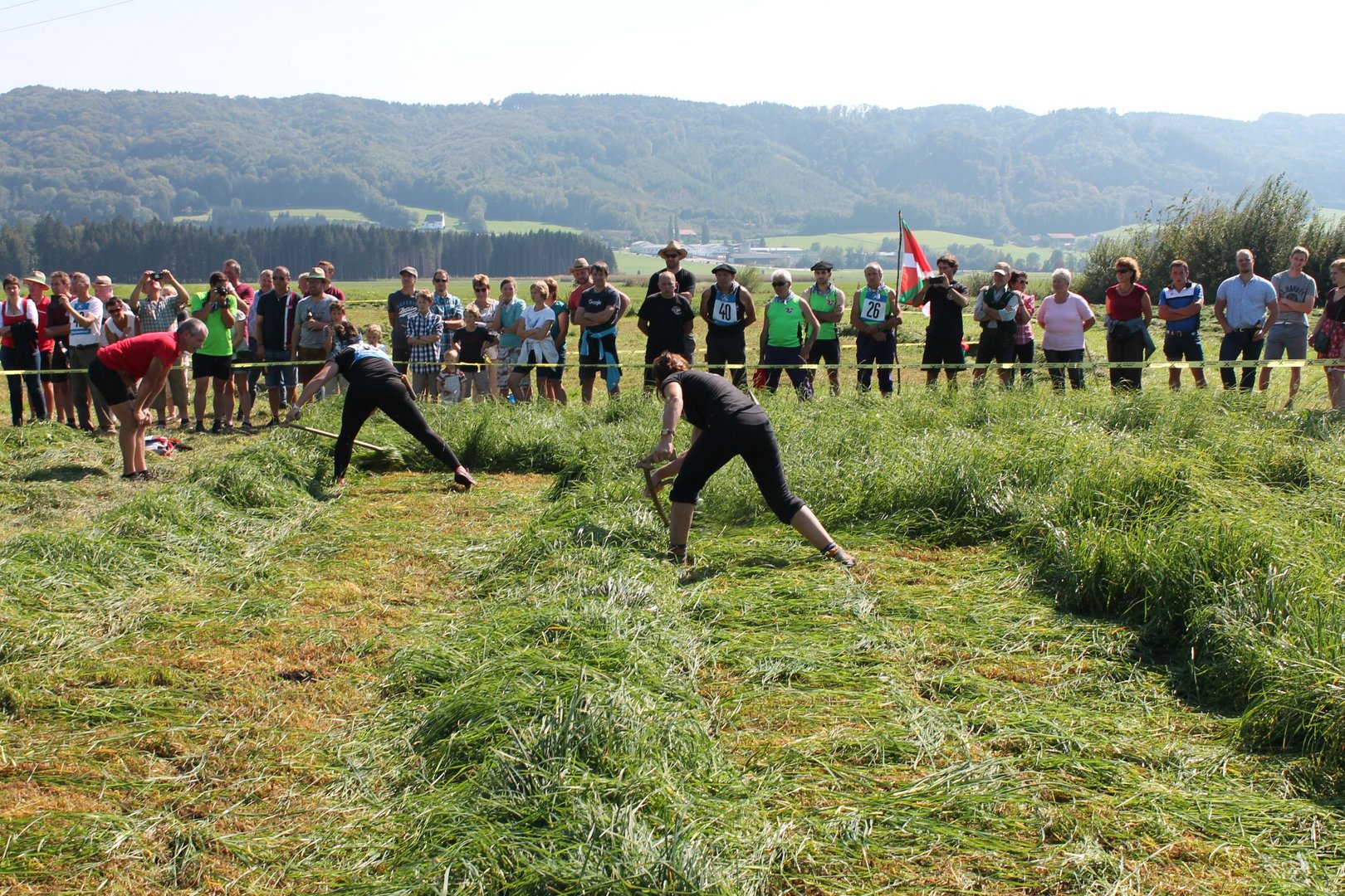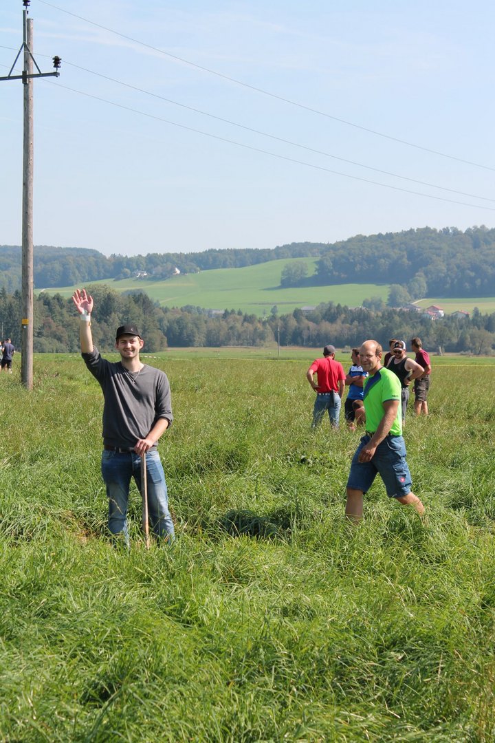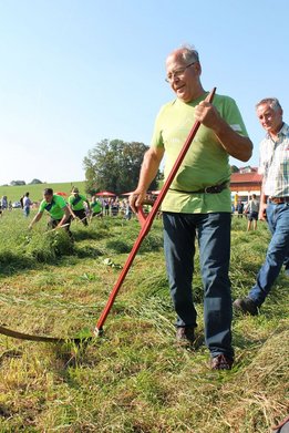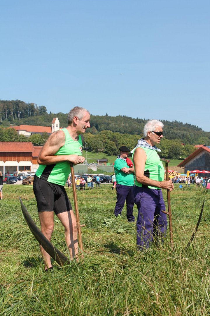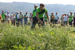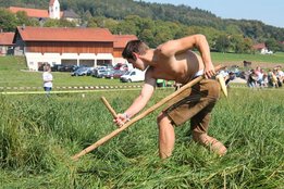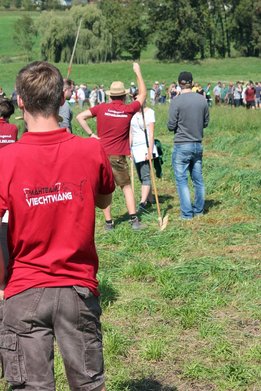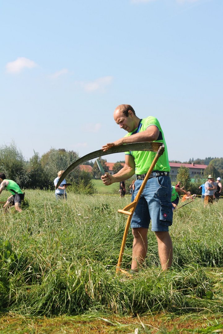 Am Sonntag, den 16. September 2018 fand das Österreich-Bayerische Mannschaftsmähen in Michaelbeuern statt. Über 160 TeilnehmerInnen aus der Schweiz, Slowenien, dem Baskenland, Südtirol und Österreich kämpften um den Meisterschaftstitel. Anders als bei den Landes- oder Bundesentscheiden der Landjugend wird beim Österreich-Bayerischen Mannschaftsmähen nicht einzeln sondern in 4er-Teams gestartet. In vier verschiedenen Kategorien kann teilgenommen werden. Die Königsklasse Herren (Sensenblattlänge über 90 cm) mäht dabei eine Fläche von 10 x 20 m und die Damen 8 x 15 m. In dieser Kategorie kommen Sensen bis zu 135 cm zum Einsatz. In der Allgemeinen Klasse (Sensenblattlänge unter 90 cm) sind Flächen von 8 x 15 m für die Herren und 6 x 10 m für die Damen zu mähen. „Auf ein gegebenes Signal beginnt der 1. Mäher der jeweiligen Mannschaft mit dem Mähen. Sobald dieser die entsprechende Markierung, die halbe Strecke der Parzellenlänge, mit der Sense erreicht hat, gibt ein zugeteilter Zeitnehmer ein deutliches Handzeichen zum Start für den zweiten Mäher der Mannschaft. Dies wiederholt sich auch bei dem dritten und vierten Mäher. Nachdem der letzte Mäher das Mähen beendet hat, wird das Ende durch ein Handzeichen angezeigt“, erklärt Teilnehmer und Organisator Matthias Huber (Landjugend Michaelbeuern) den Ablauf des Mannschaftsmähens. „Eine weitere Besonderheit des Wettbewerbes ist die Bewertung der Mahd. Diese muss gerade und gleichmäßig verlaufen. Ist die Mahd bewertet, wird das Mähgut entfernt und die Schiedsrichterkommission, bestehend aus vier Schiedsrichtern, bewertet dann die Sauberkeit“, erklärt Chef-Juror Andre Pertiller (Eugendorf) weiter.