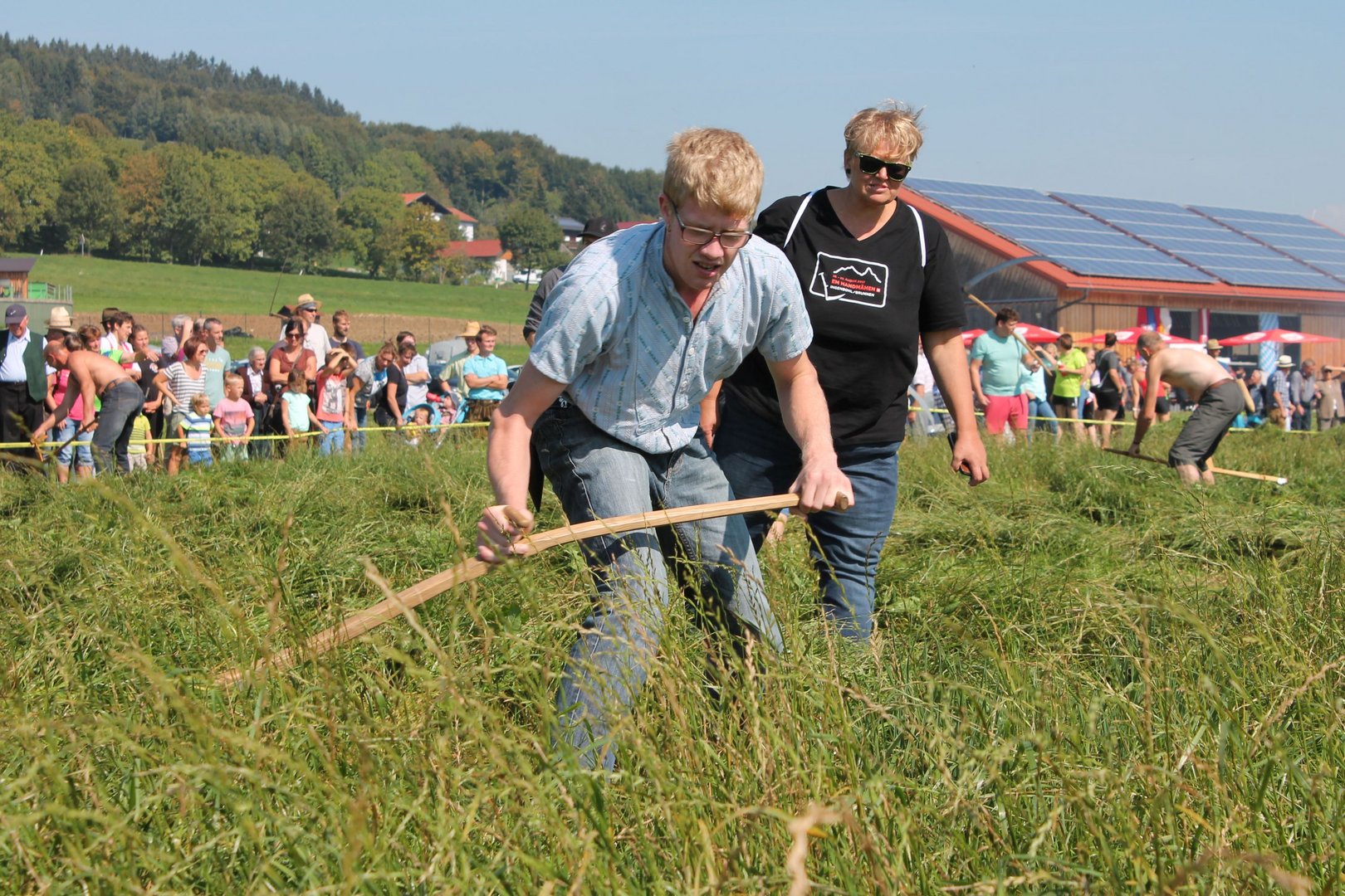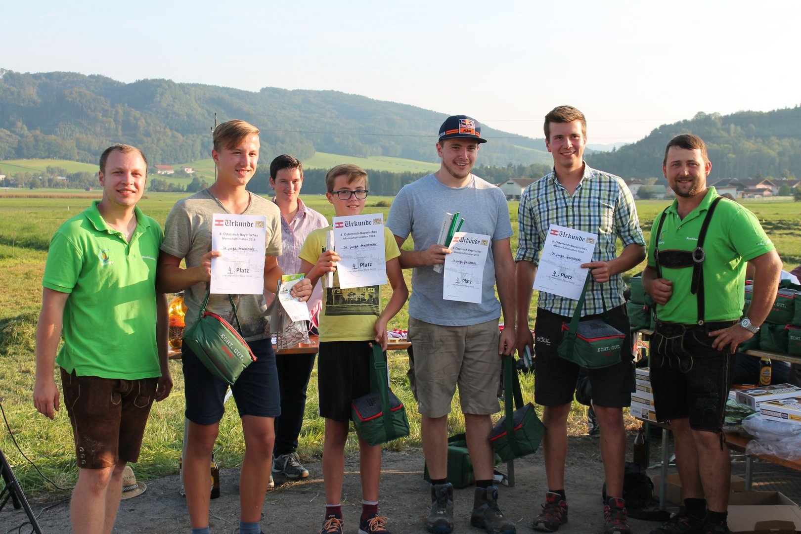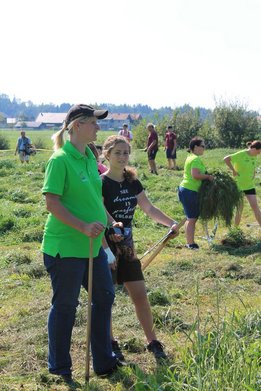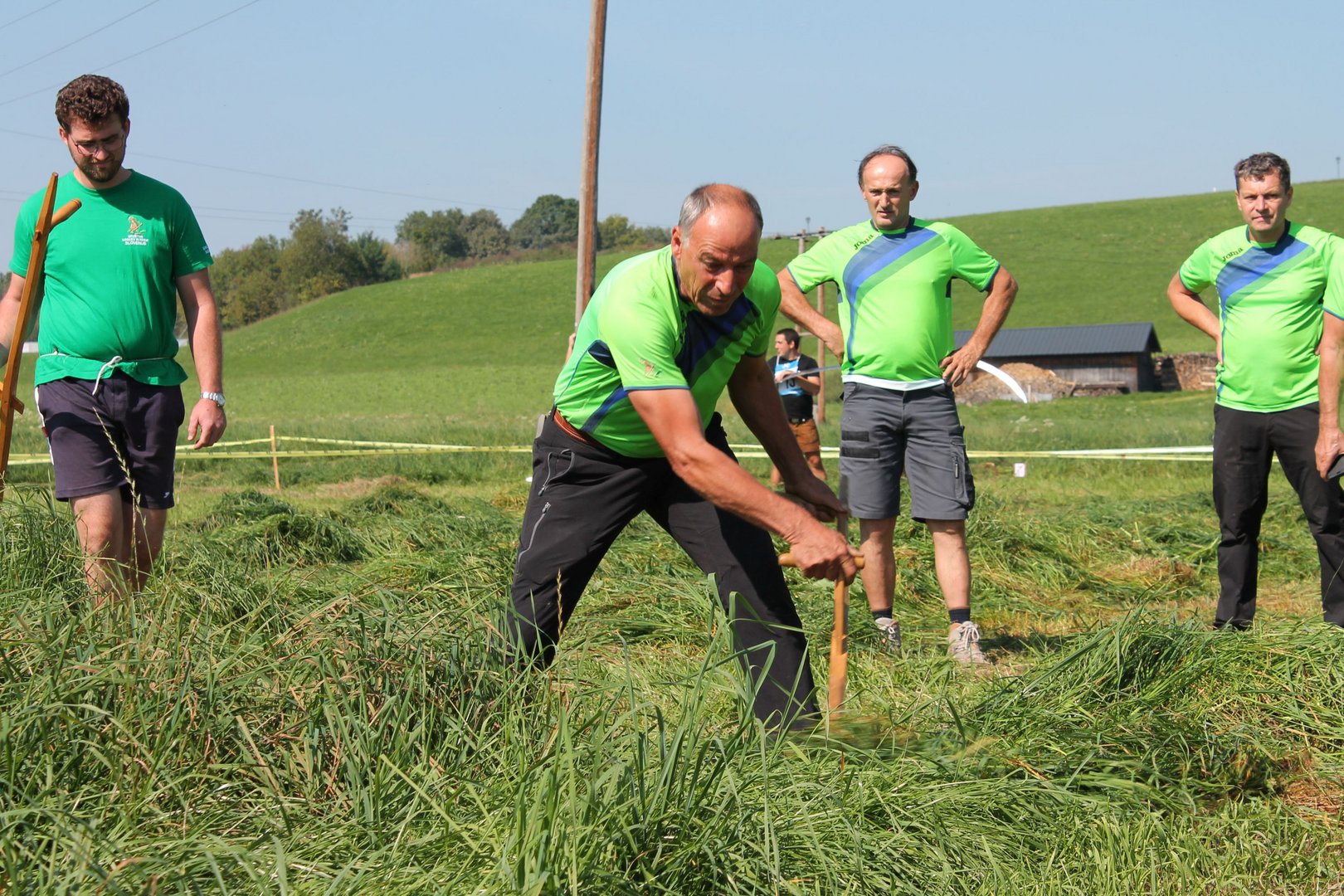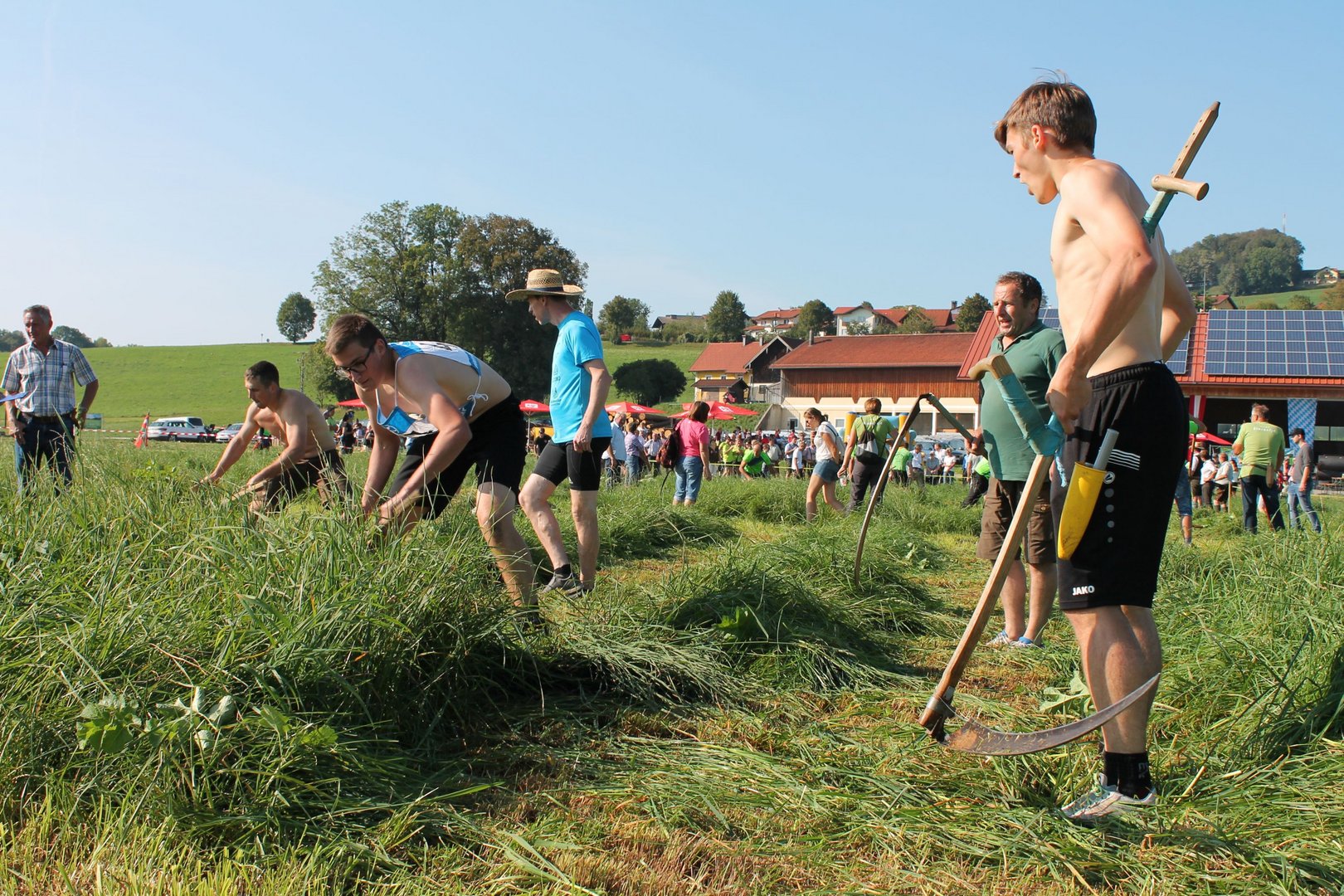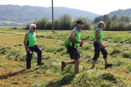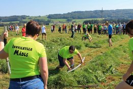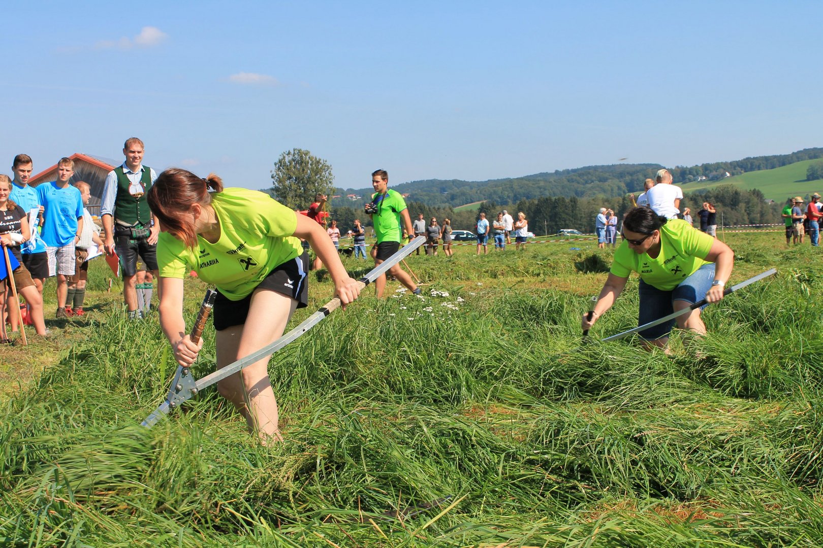 Am Sonntag, den 16. September 2018 fand das Österreich-Bayerische Mannschaftsmähen in Michaelbeuern statt. Über 160 TeilnehmerInnen aus der Schweiz, Slowenien, dem Baskenland, Südtirol und Österreich kämpften um den Meisterschaftstitel. Anders als bei den Landes- oder Bundesentscheiden der Landjugend wird beim Österreich-Bayerischen Mannschaftsmähen nicht einzeln sondern in 4er-Teams gestartet. In vier verschiedenen Kategorien kann teilgenommen werden. Die Königsklasse Herren (Sensenblattlänge über 90 cm) mäht dabei eine Fläche von 10 x 20 m und die Damen 8 x 15 m. In dieser Kategorie kommen Sensen bis zu 135 cm zum Einsatz. In der Allgemeinen Klasse (Sensenblattlänge unter 90 cm) sind Flächen von 8 x 15 m für die Herren und 6 x 10 m für die Damen zu mähen. „Auf ein gegebenes Signal beginnt der 1. Mäher der jeweiligen Mannschaft mit dem Mähen. Sobald dieser die entsprechende Markierung, die halbe Strecke der Parzellenlänge, mit der Sense erreicht hat, gibt ein zugeteilter Zeitnehmer ein deutliches Handzeichen zum Start für den zweiten Mäher der Mannschaft. Dies wiederholt sich auch bei dem dritten und vierten Mäher. Nachdem der letzte Mäher das Mähen beendet hat, wird das Ende durch ein Handzeichen angezeigt“, erklärt Teilnehmer und Organisator Matthias Huber (Landjugend Michaelbeuern) den Ablauf des Mannschaftsmähens. „Eine weitere Besonderheit des Wettbewerbes ist die Bewertung der Mahd. Diese muss gerade und gleichmäßig verlaufen. Ist die Mahd bewertet, wird das Mähgut entfernt und die Schiedsrichterkommission, bestehend aus vier Schiedsrichtern, bewertet dann die Sauberkeit“, erklärt Chef-Juror Andre Pertiller (Eugendorf) weiter.