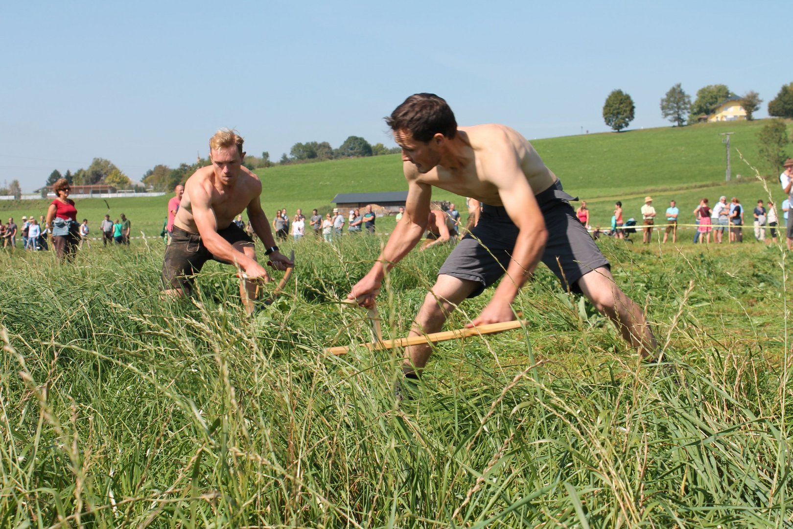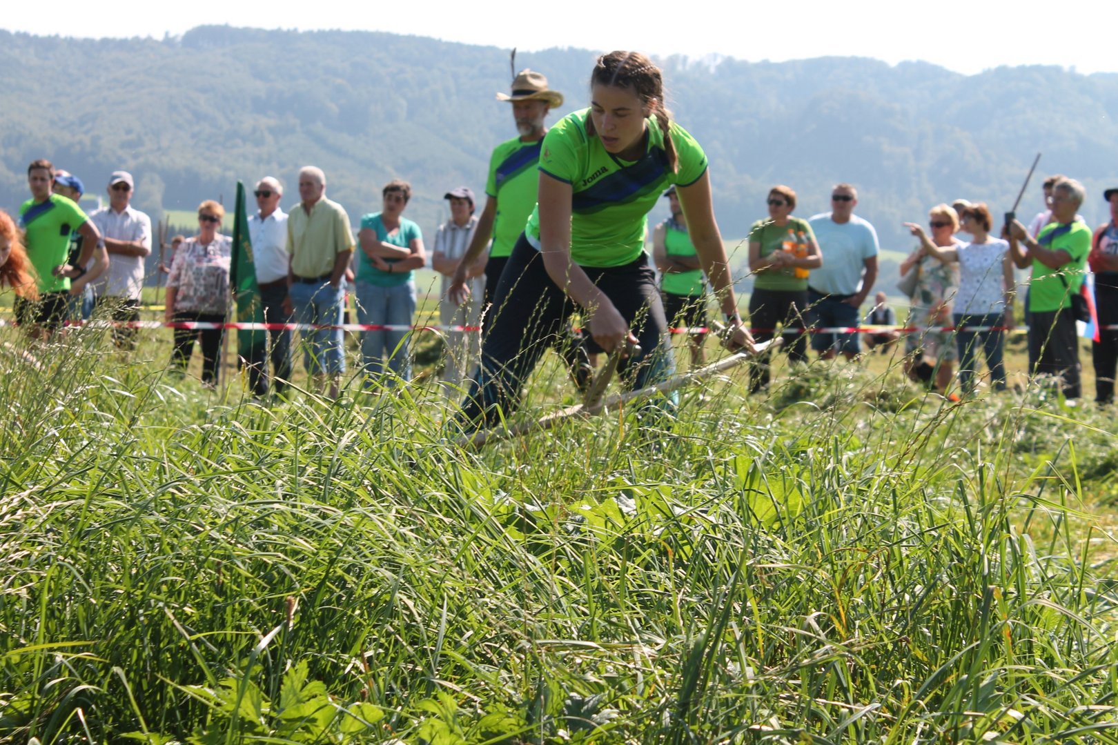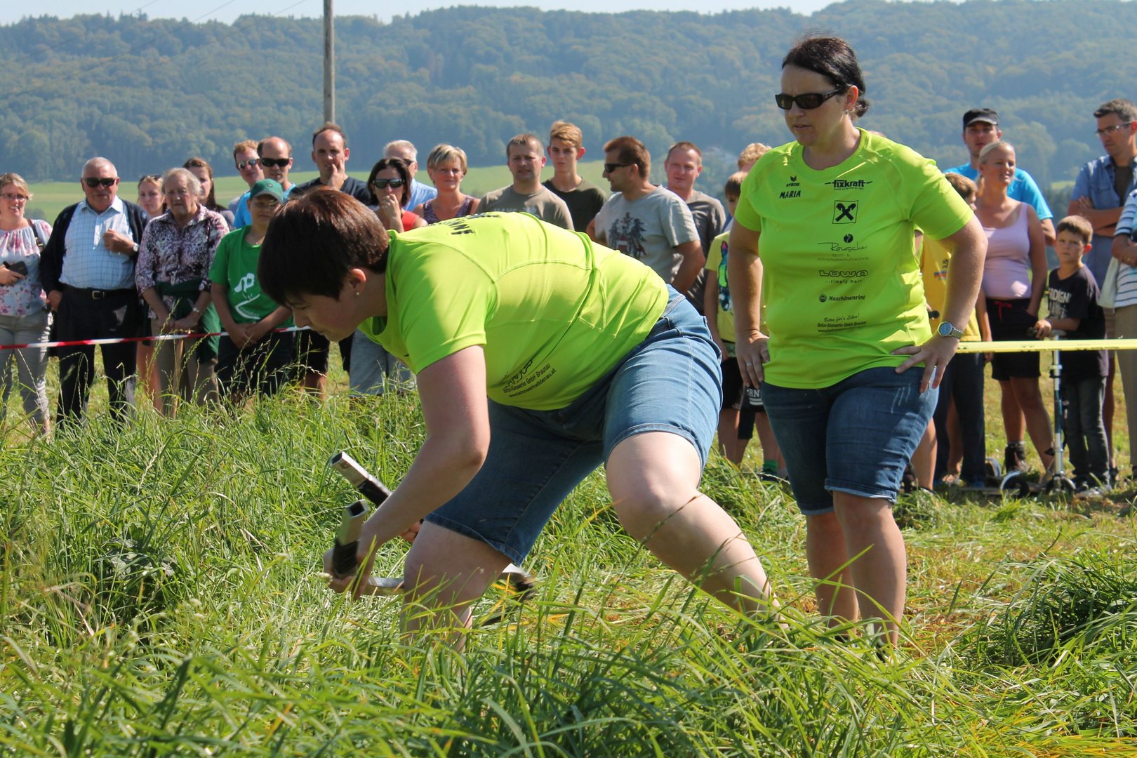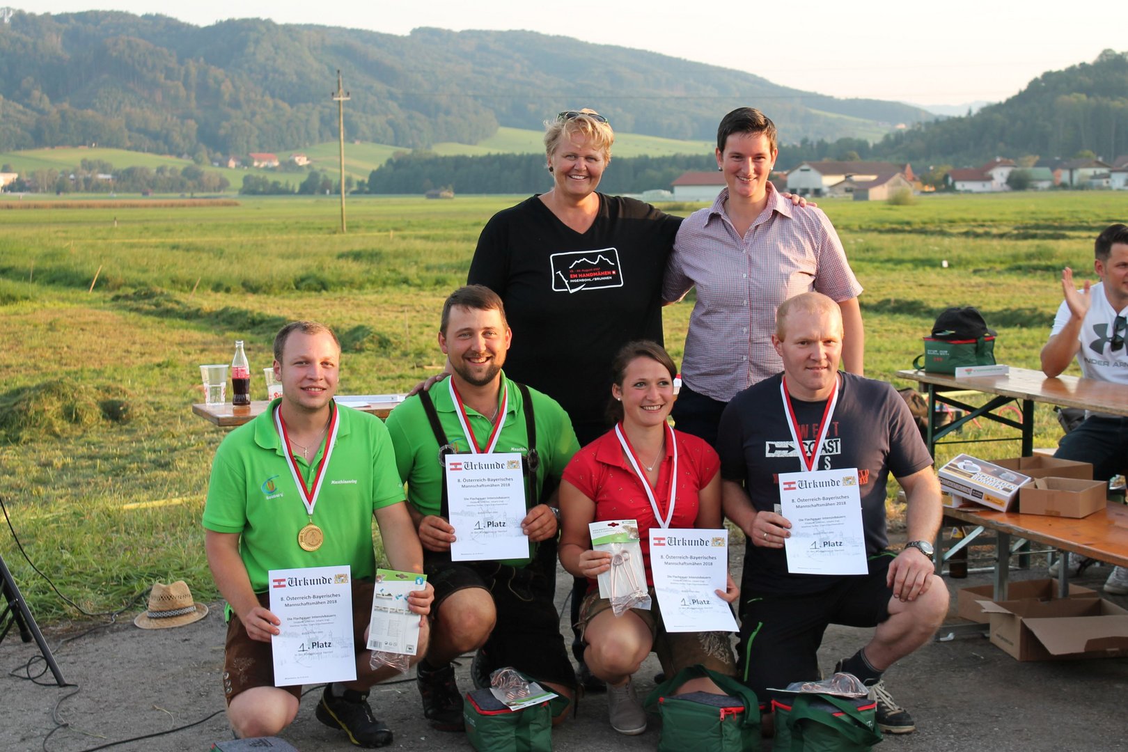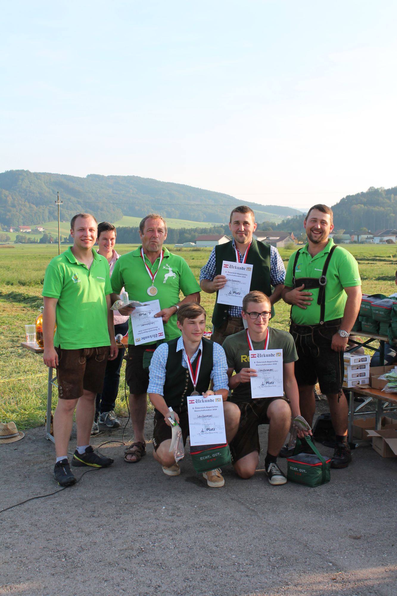 Am Sonntag, den 16. September 2018 fand das Österreich-Bayerische Mannschaftsmähen in Michaelbeuern statt. Über 160 TeilnehmerInnen aus der Schweiz, Slowenien, dem Baskenland, Südtirol und Österreich kämpften um den Meisterschaftstitel. Anders als bei den Landes- oder Bundesentscheiden der Landjugend wird beim Österreich-Bayerischen Mannschaftsmähen nicht einzeln sondern in 4er-Teams gestartet. In vier verschiedenen Kategorien kann teilgenommen werden. Die Königsklasse Herren (Sensenblattlänge über 90 cm) mäht dabei eine Fläche von 10 x 20 m und die Damen 8 x 15 m. In dieser Kategorie kommen Sensen bis zu 135 cm zum Einsatz. In der Allgemeinen Klasse (Sensenblattlänge unter 90 cm) sind Flächen von 8 x 15 m für die Herren und 6 x 10 m für die Damen zu mähen. „Auf ein gegebenes Signal beginnt der 1. Mäher der jeweiligen Mannschaft mit dem Mähen. Sobald dieser die entsprechende Markierung, die halbe Strecke der Parzellenlänge, mit der Sense erreicht hat, gibt ein zugeteilter Zeitnehmer ein deutliches Handzeichen zum Start für den zweiten Mäher der Mannschaft. Dies wiederholt sich auch bei dem dritten und vierten Mäher. Nachdem der letzte Mäher das Mähen beendet hat, wird das Ende durch ein Handzeichen angezeigt“, erklärt Teilnehmer und Organisator Matthias Huber (Landjugend Michaelbeuern) den Ablauf des Mannschaftsmähens. „Eine weitere Besonderheit des Wettbewerbes ist die Bewertung der Mahd. Diese muss gerade und gleichmäßig verlaufen. Ist die Mahd bewertet, wird das Mähgut entfernt und die Schiedsrichterkommission, bestehend aus vier Schiedsrichtern, bewertet dann die Sauberkeit“, erklärt Chef-Juror Andre Pertiller (Eugendorf) weiter.