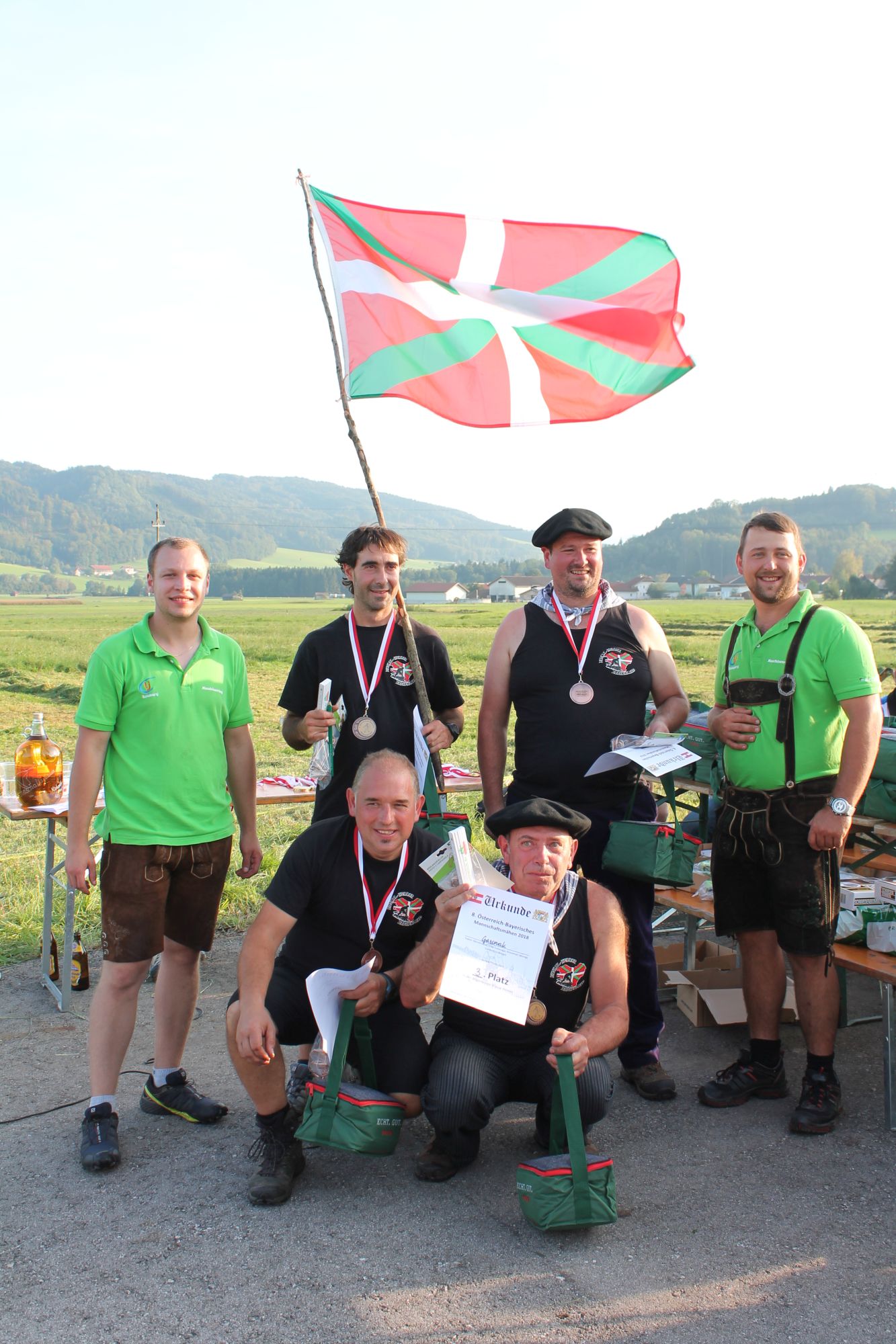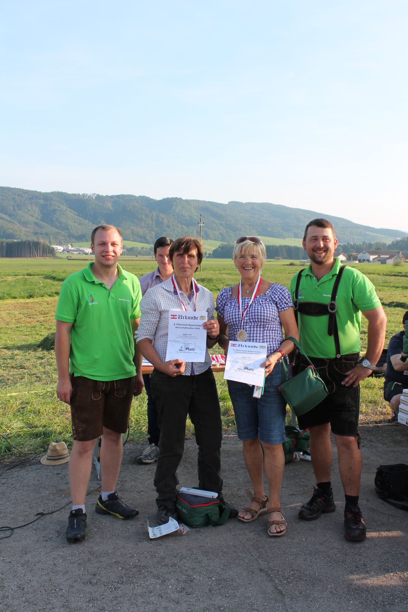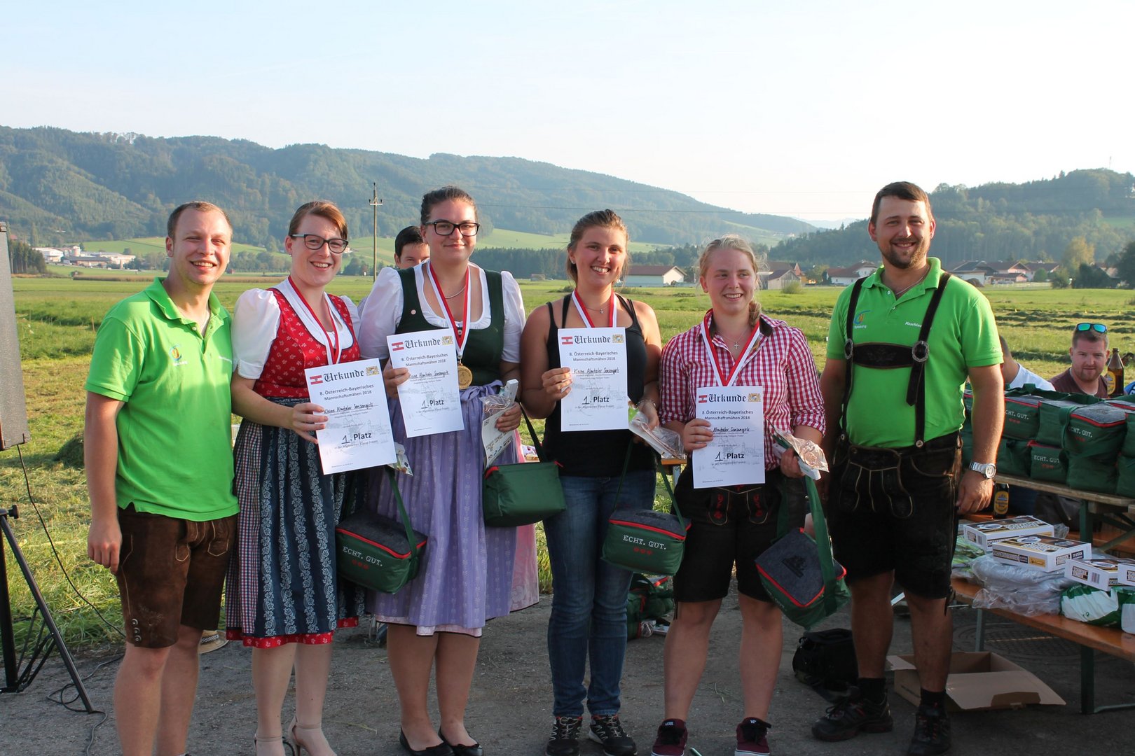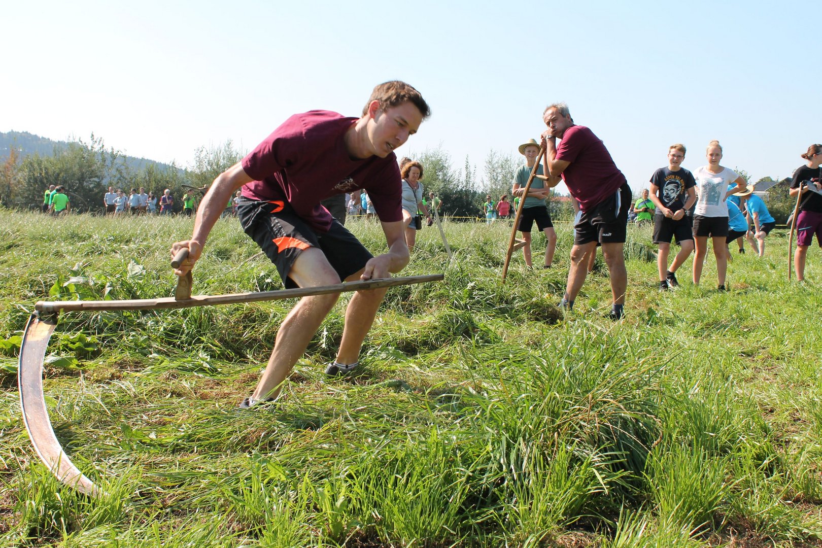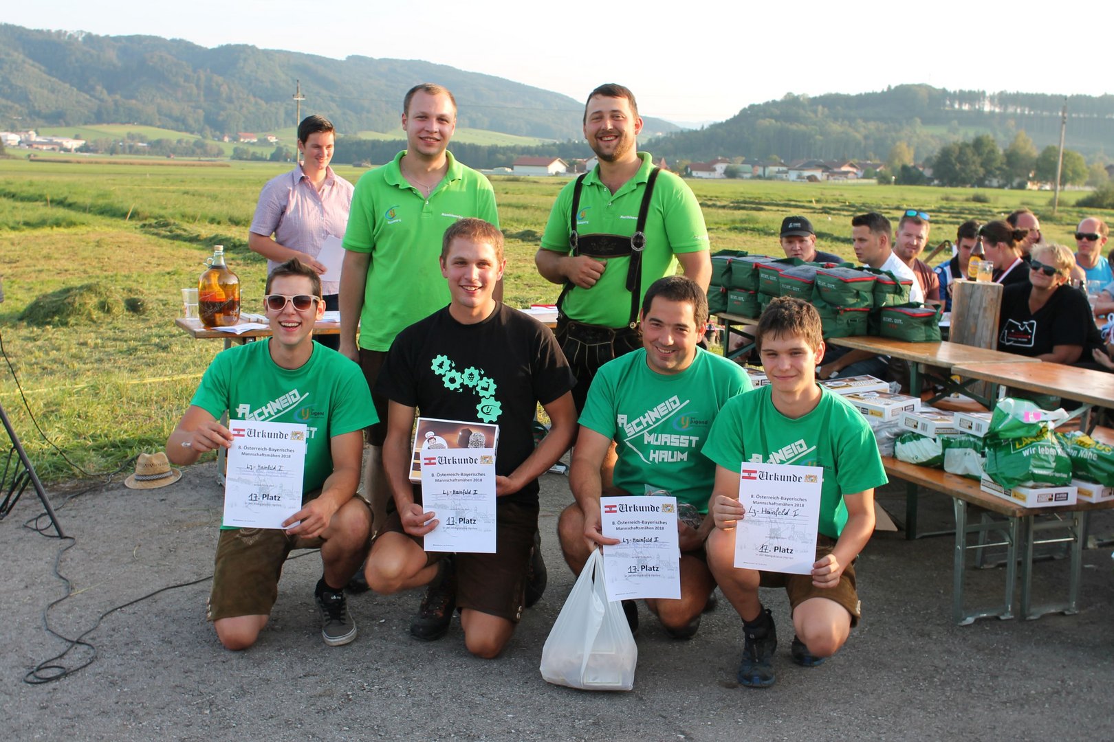 Am Sonntag, den 16. September 2018 fand das Österreich-Bayerische Mannschaftsmähen in Michaelbeuern statt. Über 160 TeilnehmerInnen aus der Schweiz, Slowenien, dem Baskenland, Südtirol und Österreich kämpften um den Meisterschaftstitel. Anders als bei den Landes- oder Bundesentscheiden der Landjugend wird beim Österreich-Bayerischen Mannschaftsmähen nicht einzeln sondern in 4er-Teams gestartet. In vier verschiedenen Kategorien kann teilgenommen werden. Die Königsklasse Herren (Sensenblattlänge über 90 cm) mäht dabei eine Fläche von 10 x 20 m und die Damen 8 x 15 m. In dieser Kategorie kommen Sensen bis zu 135 cm zum Einsatz. In der Allgemeinen Klasse (Sensenblattlänge unter 90 cm) sind Flächen von 8 x 15 m für die Herren und 6 x 10 m für die Damen zu mähen. „Auf ein gegebenes Signal beginnt der 1. Mäher der jeweiligen Mannschaft mit dem Mähen. Sobald dieser die entsprechende Markierung, die halbe Strecke der Parzellenlänge, mit der Sense erreicht hat, gibt ein zugeteilter Zeitnehmer ein deutliches Handzeichen zum Start für den zweiten Mäher der Mannschaft. Dies wiederholt sich auch bei dem dritten und vierten Mäher. Nachdem der letzte Mäher das Mähen beendet hat, wird das Ende durch ein Handzeichen angezeigt“, erklärt Teilnehmer und Organisator Matthias Huber (Landjugend Michaelbeuern) den Ablauf des Mannschaftsmähens. „Eine weitere Besonderheit des Wettbewerbes ist die Bewertung der Mahd. Diese muss gerade und gleichmäßig verlaufen. Ist die Mahd bewertet, wird das Mähgut entfernt und die Schiedsrichterkommission, bestehend aus vier Schiedsrichtern, bewertet dann die Sauberkeit“, erklärt Chef-Juror Andre Pertiller (Eugendorf) weiter.