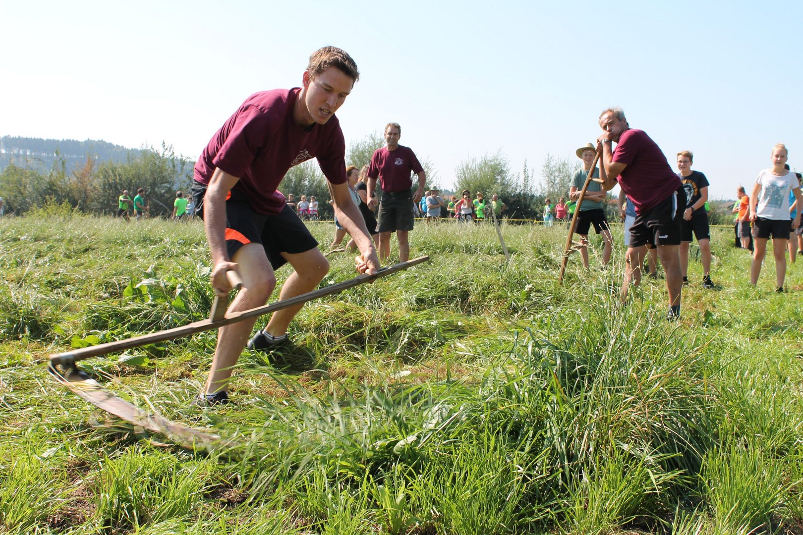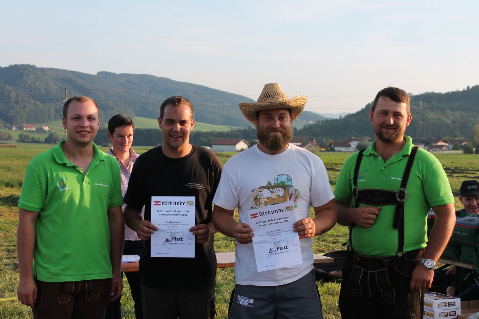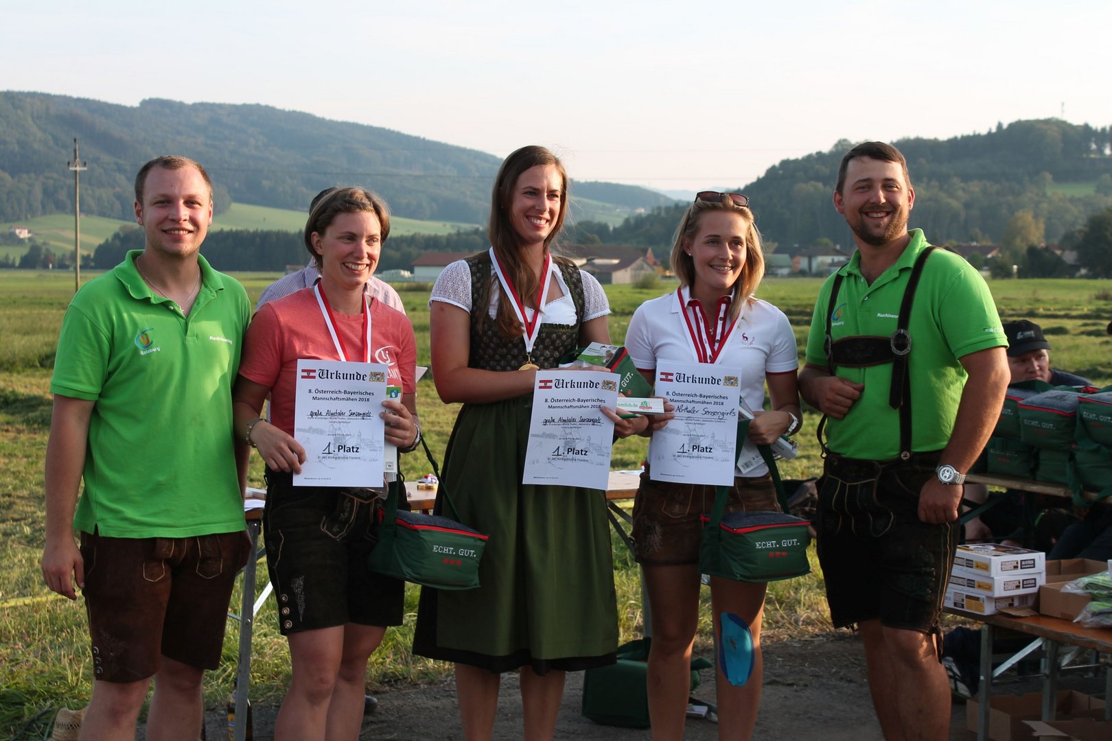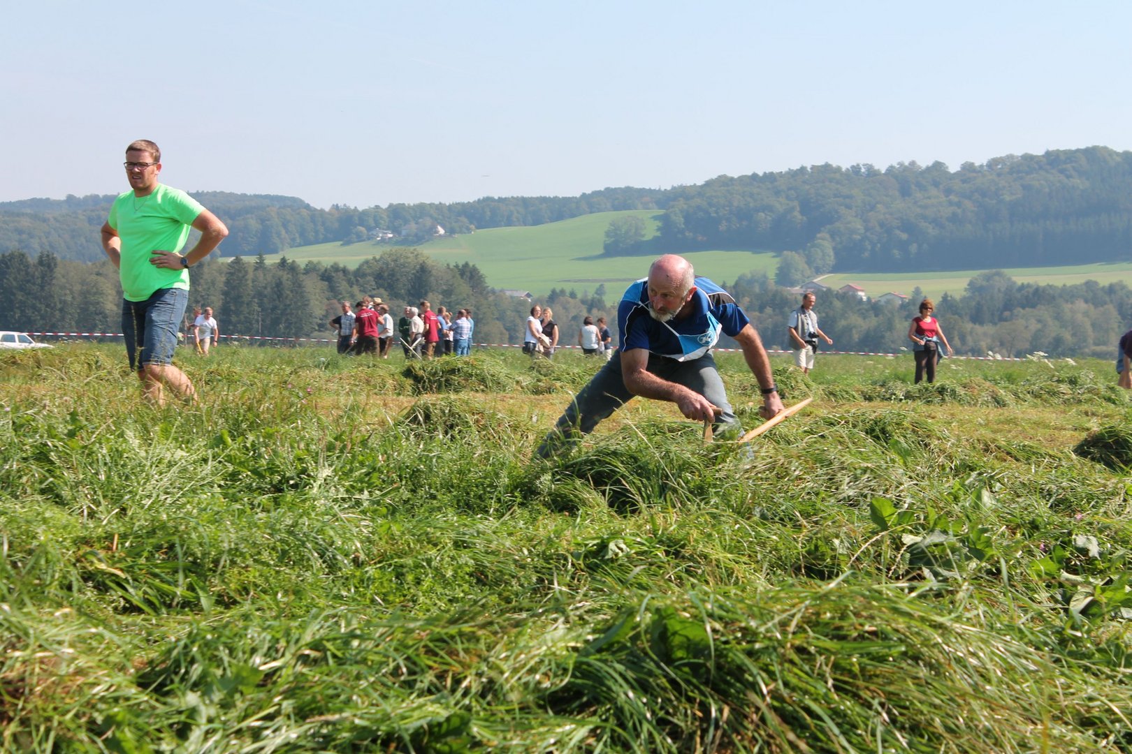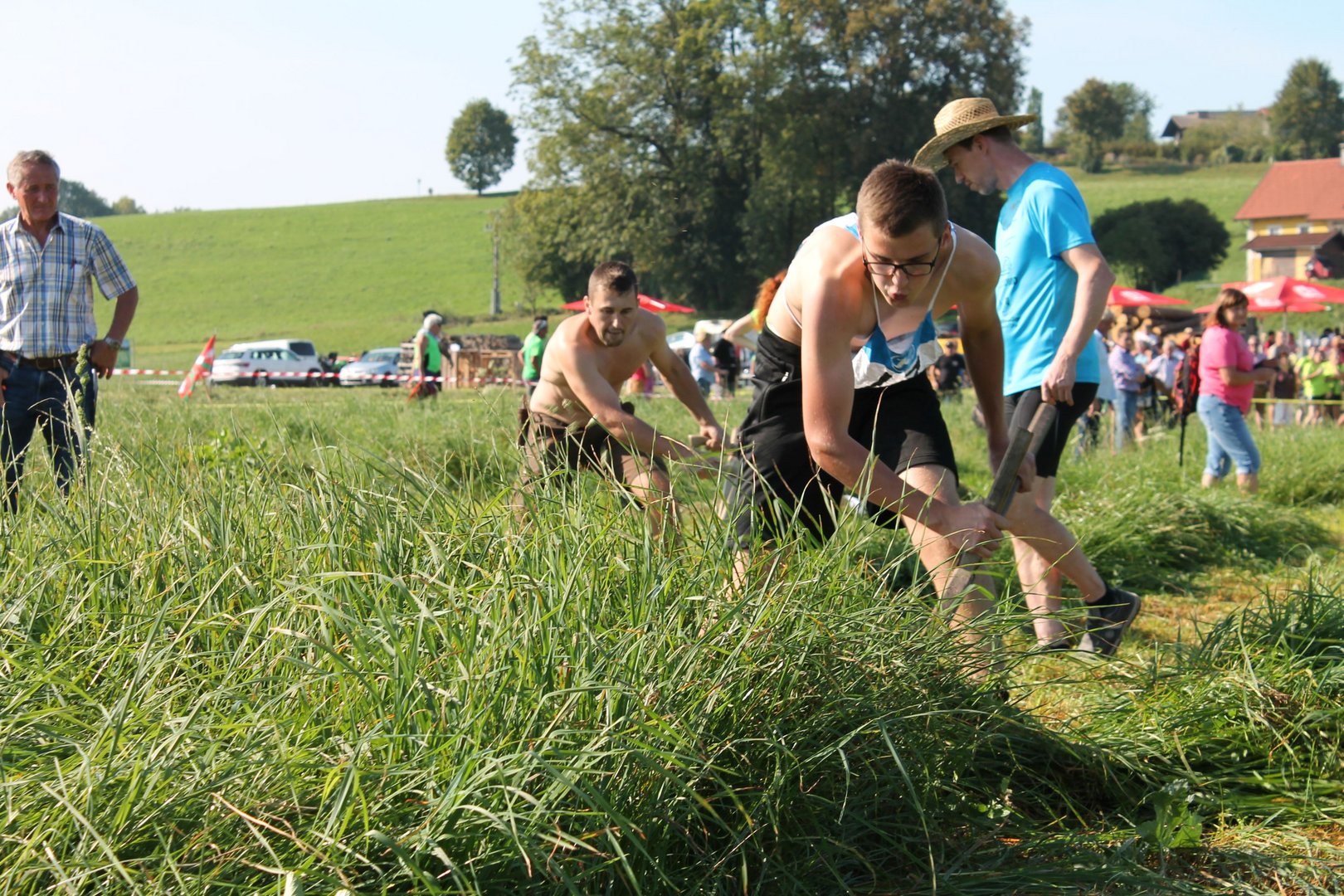 Am Sonntag, den 16. September 2018 fand das Österreich-Bayerische Mannschaftsmähen in Michaelbeuern statt. Über 160 TeilnehmerInnen aus der Schweiz, Slowenien, dem Baskenland, Südtirol und Österreich kämpften um den Meisterschaftstitel. Anders als bei den Landes- oder Bundesentscheiden der Landjugend wird beim Österreich-Bayerischen Mannschaftsmähen nicht einzeln sondern in 4er-Teams gestartet. In vier verschiedenen Kategorien kann teilgenommen werden. Die Königsklasse Herren (Sensenblattlänge über 90 cm) mäht dabei eine Fläche von 10 x 20 m und die Damen 8 x 15 m. In dieser Kategorie kommen Sensen bis zu 135 cm zum Einsatz. In der Allgemeinen Klasse (Sensenblattlänge unter 90 cm) sind Flächen von 8 x 15 m für die Herren und 6 x 10 m für die Damen zu mähen. „Auf ein gegebenes Signal beginnt der 1. Mäher der jeweiligen Mannschaft mit dem Mähen. Sobald dieser die entsprechende Markierung, die halbe Strecke der Parzellenlänge, mit der Sense erreicht hat, gibt ein zugeteilter Zeitnehmer ein deutliches Handzeichen zum Start für den zweiten Mäher der Mannschaft. Dies wiederholt sich auch bei dem dritten und vierten Mäher. Nachdem der letzte Mäher das Mähen beendet hat, wird das Ende durch ein Handzeichen angezeigt“, erklärt Teilnehmer und Organisator Matthias Huber (Landjugend Michaelbeuern) den Ablauf des Mannschaftsmähens. „Eine weitere Besonderheit des Wettbewerbes ist die Bewertung der Mahd. Diese muss gerade und gleichmäßig verlaufen. Ist die Mahd bewertet, wird das Mähgut entfernt und die Schiedsrichterkommission, bestehend aus vier Schiedsrichtern, bewertet dann die Sauberkeit“, erklärt Chef-Juror Andre Pertiller (Eugendorf) weiter.